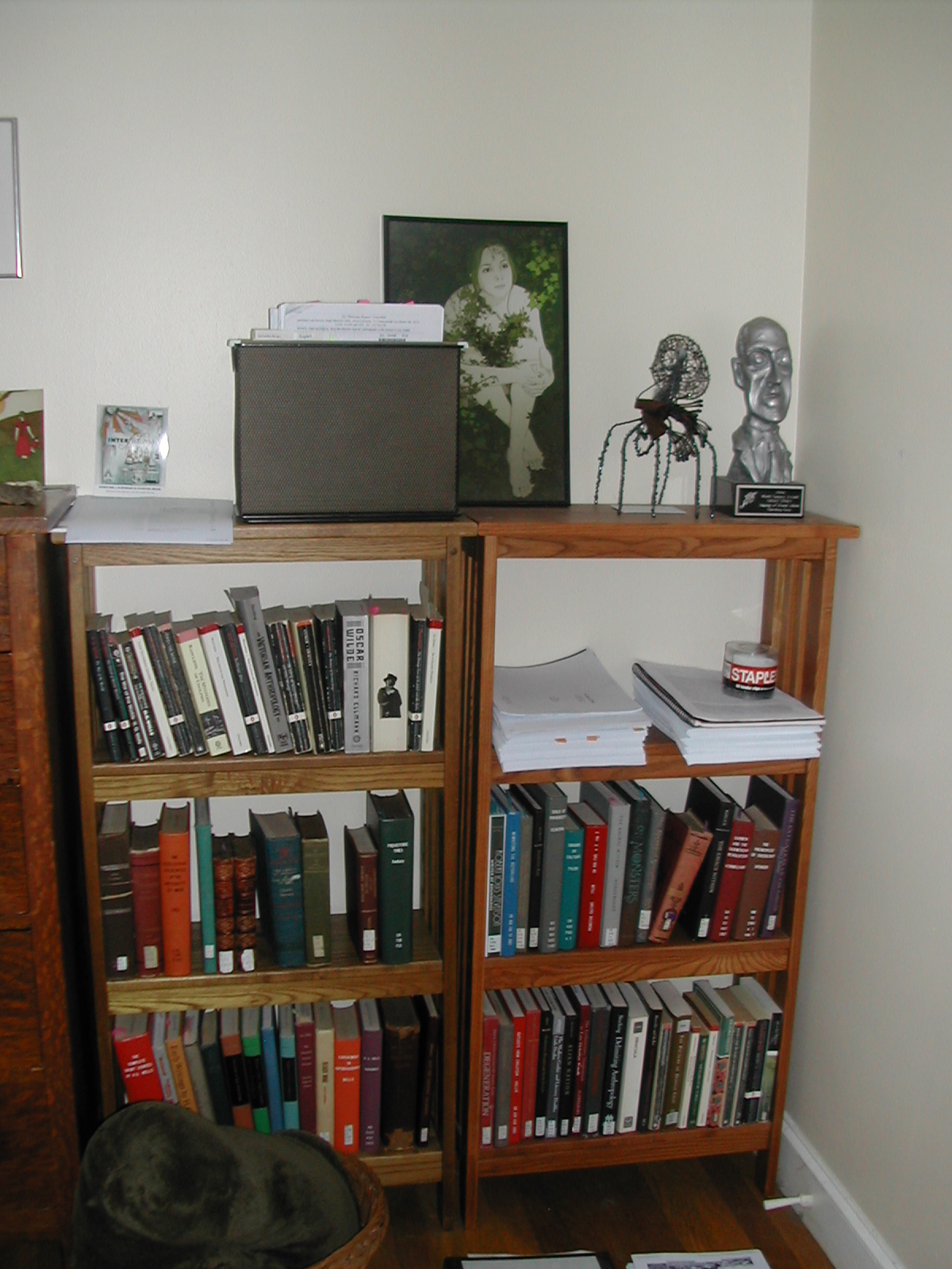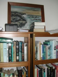 These are two of my shelves, and you can see how messy they are.  On top I have notebooks with stories I’m working on, and a picture I haven’t yet hung up.  That small black box is filled with contact information for people I know in the writing world, people I’ve met at conventions, etc.  It’s my box of professional contact information.  I suggest that every writer have one.