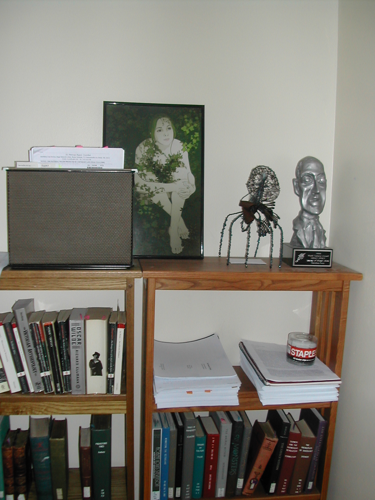Two more of my bookshelves, with Mr. Lovecraft Head (yes, that’s my World Fantasy Award) and one of the most wonderful presents anyone has ever given me, the poet Elah Gal from “Child-Empress of Mars” sculpted by C. Jane Washburn.  Also another picture (a digital one) I have not yet hung up.