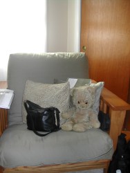 This is the comfortable chair, with Dani, the bear I received for my first Christmas, and a pillow I sewed from William Morris fabric (can you see a theme emerging?), and my purse. (No, I did not straighten anything before taking these pictures. Perhaps I should have.) The book on the pillow is Kage Baker’s The Hotel Under the Sand, which I am currently reading. The books on the arm of the chair are a set of John Carter of Mars novels, which I’m using to research a story I’m currently writing, on top of the notebooks in which I’m writing the story.