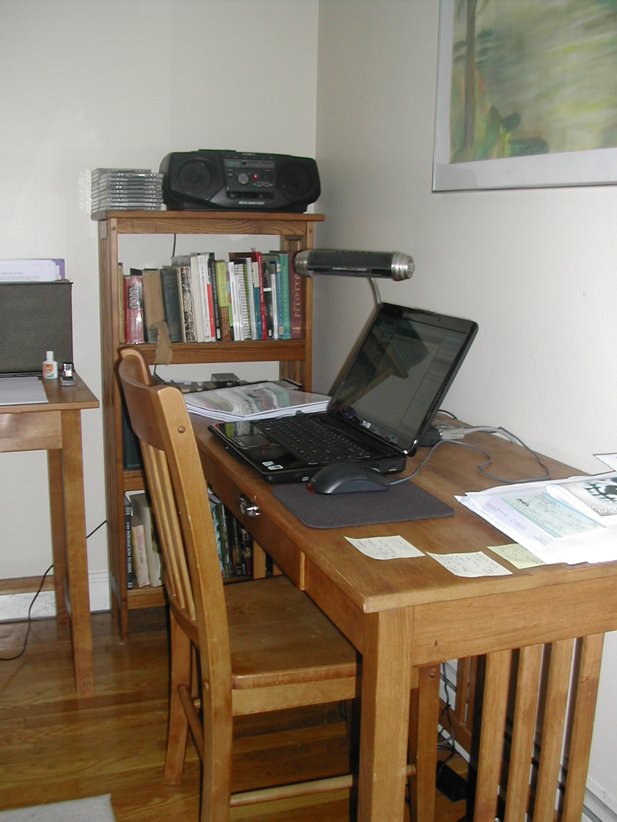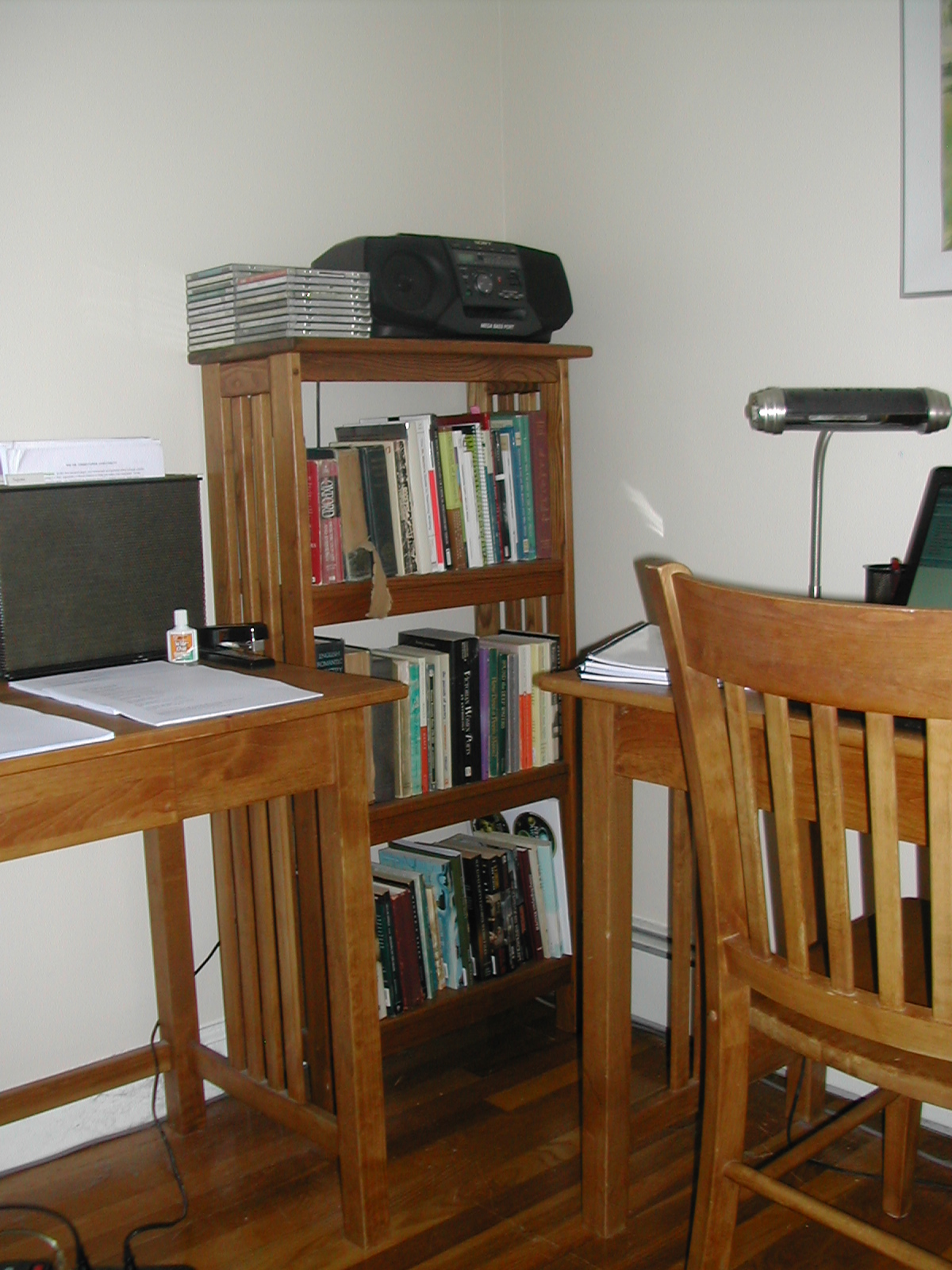 This is my desk, which was also shown on Terri’s blog.  The CDs stacked on the shelf, by the ancient boombox I salvaged from the basement of the apartment building where I used to live, are mostly Loreena McKennitt, music from the Renaissance, or experimental modern music (Eric Satie, Arvo Pärt, Morton Feldman).