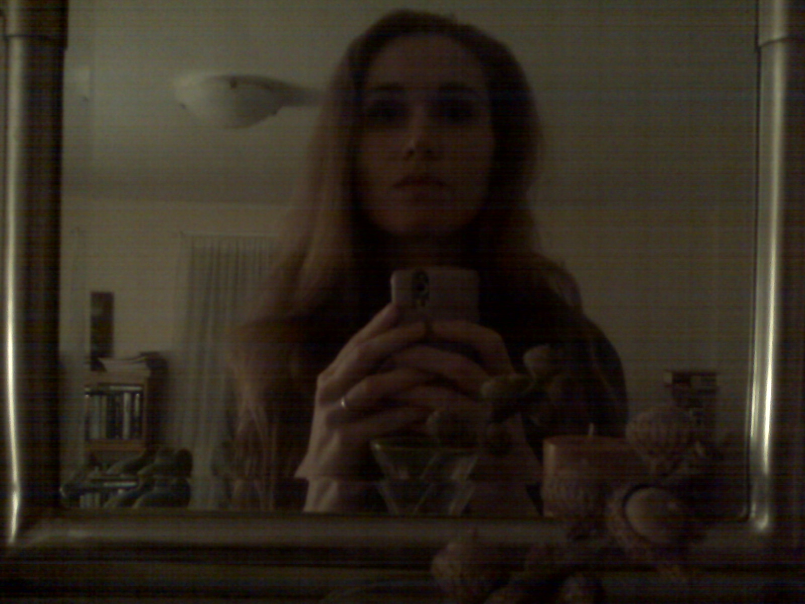 You’re still in the darkness of winter. Yesterday, I was looking at myself in the mirror on top of my dresser, and I saw myself in that darkness, so I decided to take a picture of it: