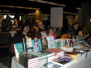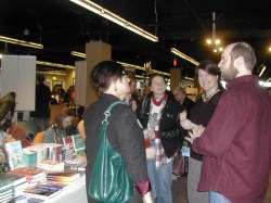 Genevieve Valentine was talking to some friends in front of the Small Beer Press table. Unfortunately, a fight broke out.