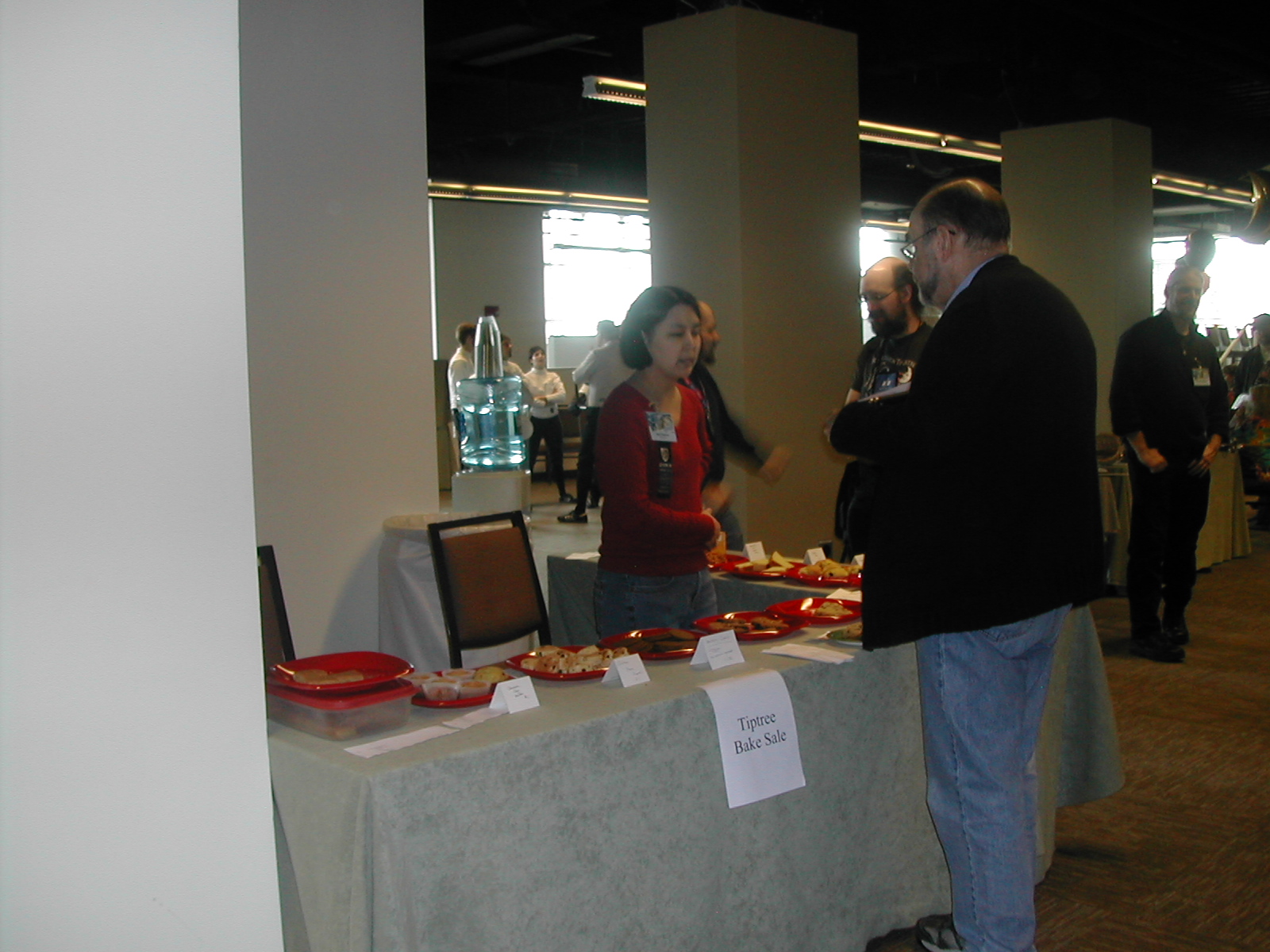 I bought an oat cake at the Tiptree Bake Sale and then went over to the Small Beer Press table. Here you see Gavin Grant, his daughter Ursula, and Michael DeLuca.