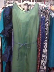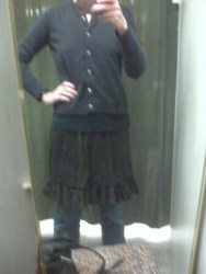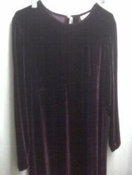 I didn’t even bother trying on this dress. It was loose enough that it was going to fit me no matter what. Here it is on the left on a hanger in the dressing room, and on the right on me, after being washed, at home. It’s a cascade of burgundy silk velvet, incredibly soft and comfortable, and I’m seriously considering it for an ICFA banquet dress. It’s in the final three. (I think it looks like something the pre-Raphaelites would paint.)