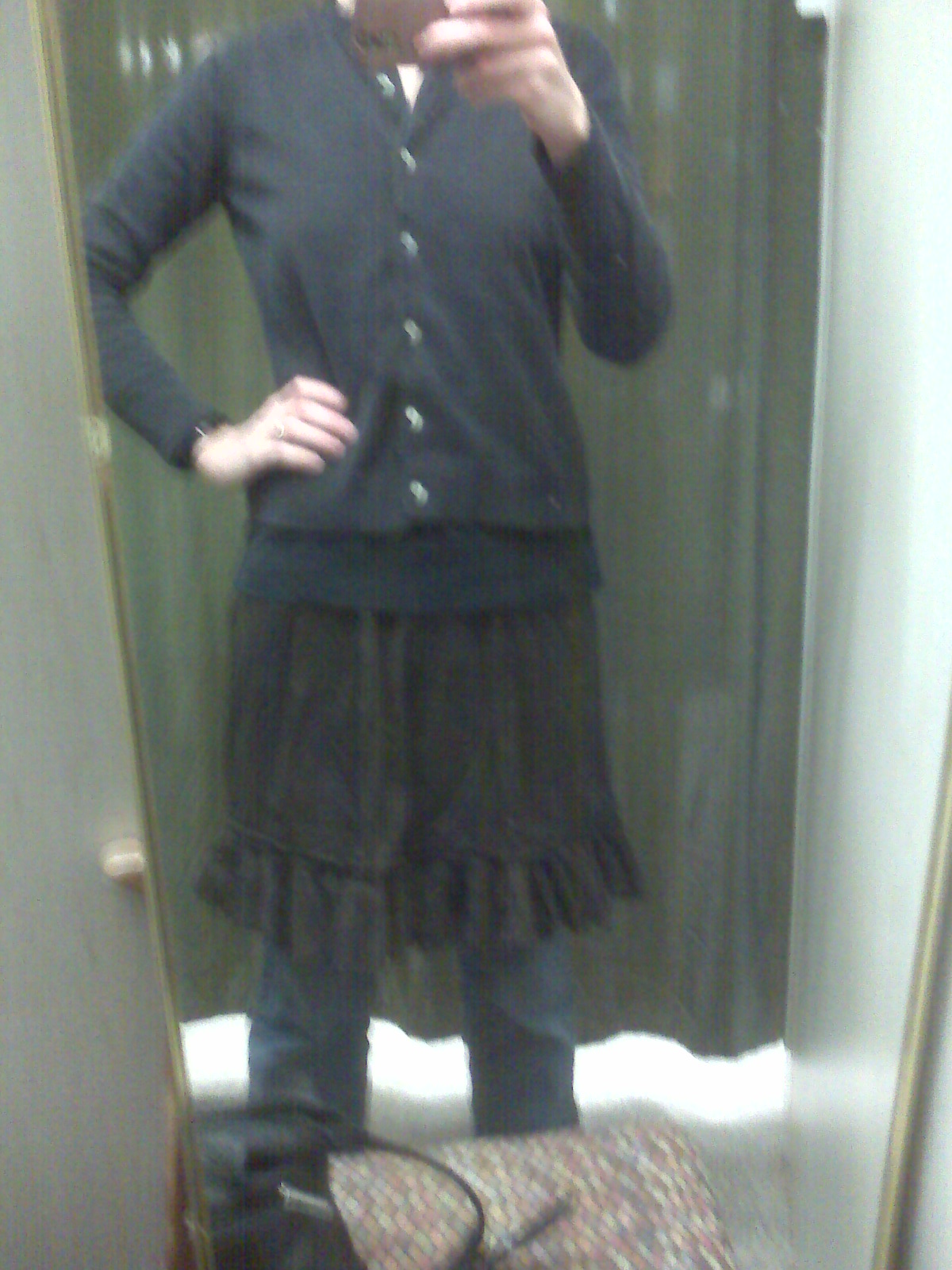 Here, on the left, is an Eileen Fisher dress that was lovely, lime green underdress and a blue overlay. But so not my colors. What I bought instead is the skirt on the right, an Ann Taylor cotton summer skirt. I hate trying things on, and usually I don’t bother because I know my size and I can tell visually whether something will fit. But this was a size 0P, and the P changes the sizing. (I don’t usually wear petites.) So I tried it on, and it fit just fine, even over jeans.