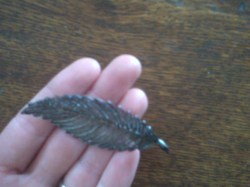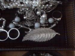 On my way out, I saw this silver leaf pin. It was pretty tarnished, but I knew it would clean up nicely. Here it is as I found it in the thrift store and after cleaning, with my other jewelry.