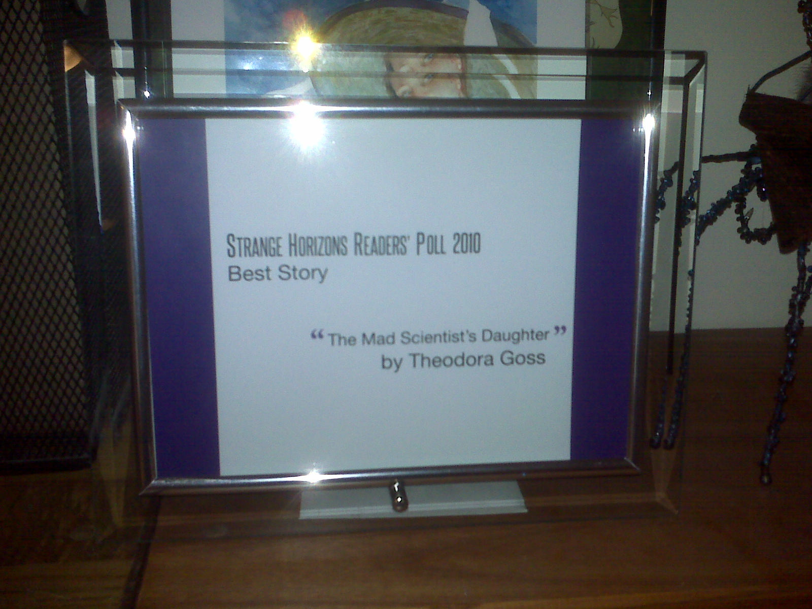 It’s my plaque from Strange Horizons, sent to me because “The Mad Scientist’s Daughter” won the readers’ poll for best short story! That means a tremendous amount to me because it’s a readers’ poll, and what I do is for readers. If there were no readers, there would be no reason for me to write.