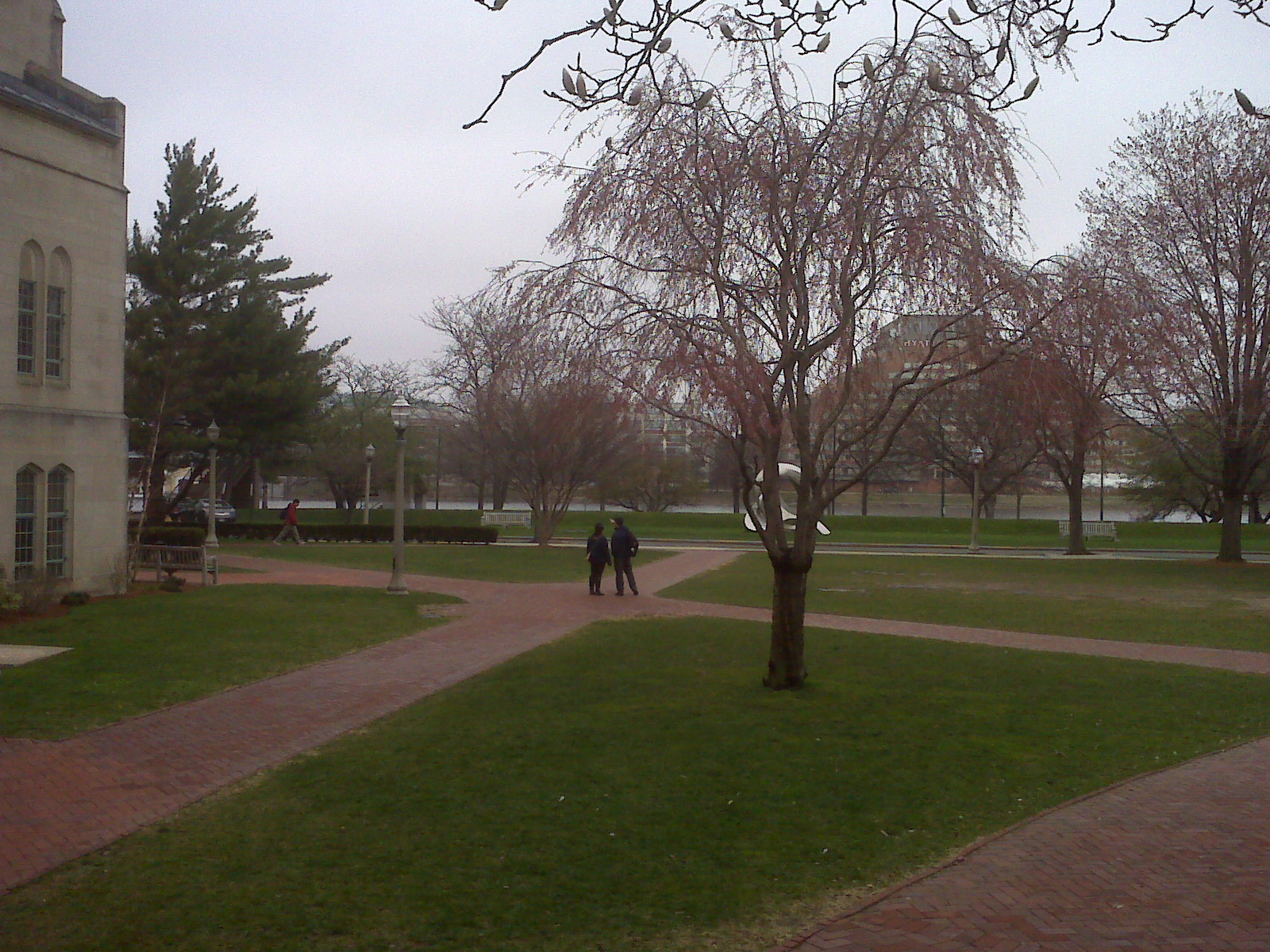Through the archway is the nicest green space on campus. That river in the background is the Charles. It’s too cold today, but usually walking through this space involves convincing yourself that no, the frisbees aren’t going to hit you.