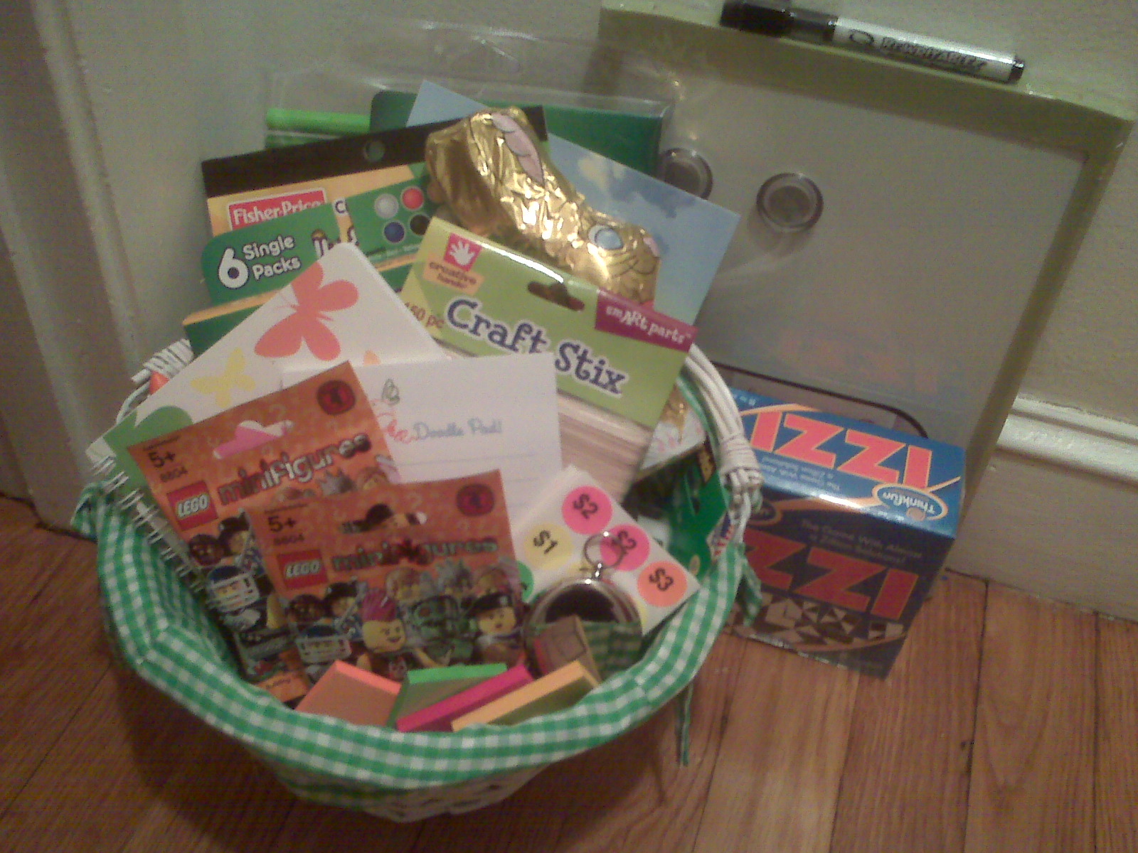 When I had put it together, I realized what an unusual Easter basket it was. It contained a chocolate bunny, but also markers, a sticker book, Model Magic, craft sticks, a small notebook with butterflies on the cover, a sticky notepad, two Lego figures, tape, stickers with prices on them (for when she plays store), a compass, multicolored stickies, a logic game, and a white board.