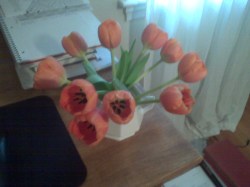 Then we had lunch, with everything I had requested: corn and pepper soup, roast beef sandwiches, chocolate mousse cake. Ophelia had picked out a bunch of tulips, and I put them into a white stoneware sugar bowl I had bought long ago. It had been missing its lid, but I thought it would be perfect for flowers. And so it is.