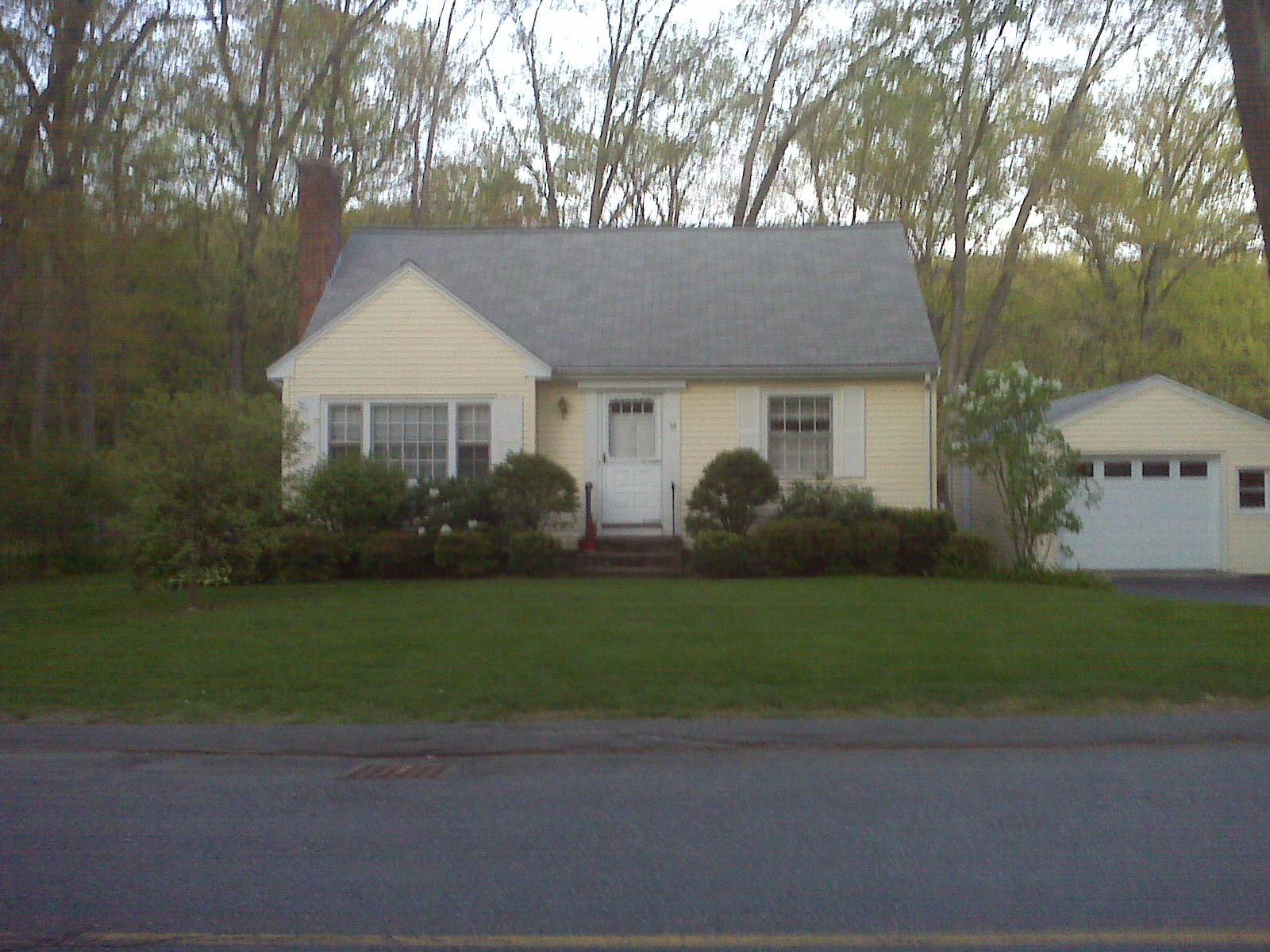 A yellow house with lace curtains.