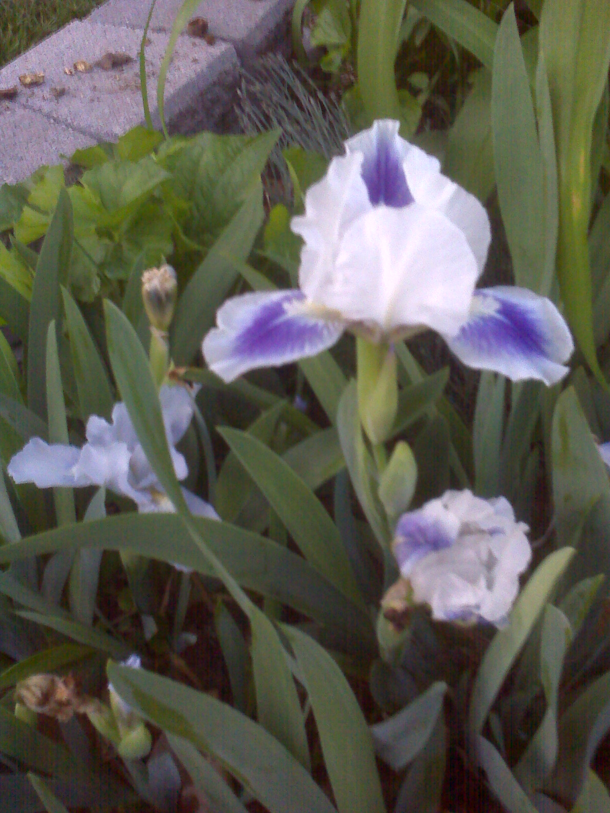 A white and purple iris in a garden.