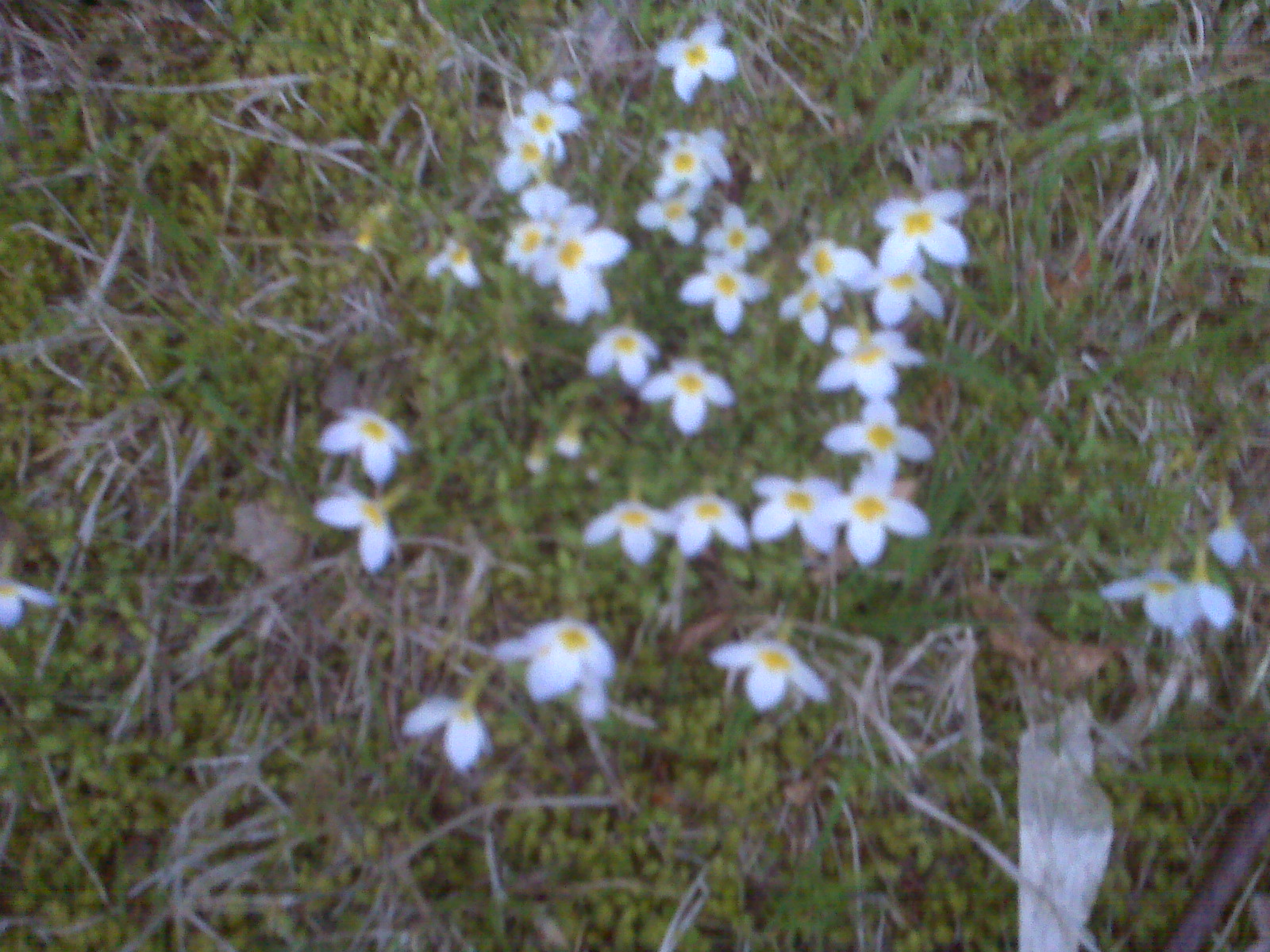 Some small white flowers in a field.