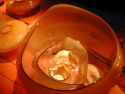 What I did like were the smaller jars based on Native American baskets, displayed with Chihuly’s basket collection. And the large jars displayed here on a slab of wood. They were quite delicate, and looked almost like natural objects.