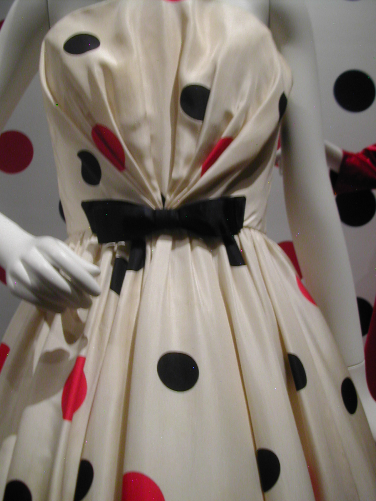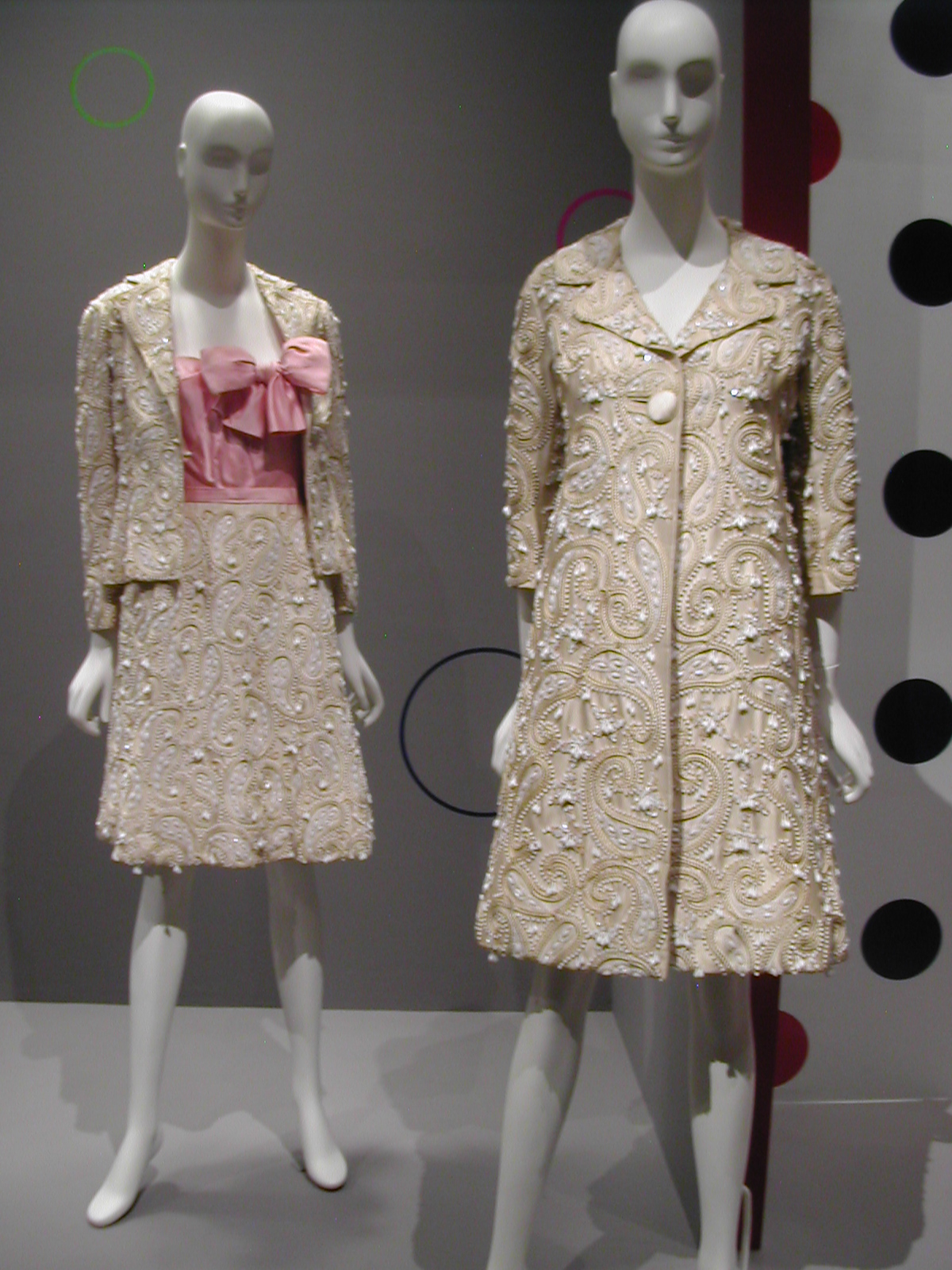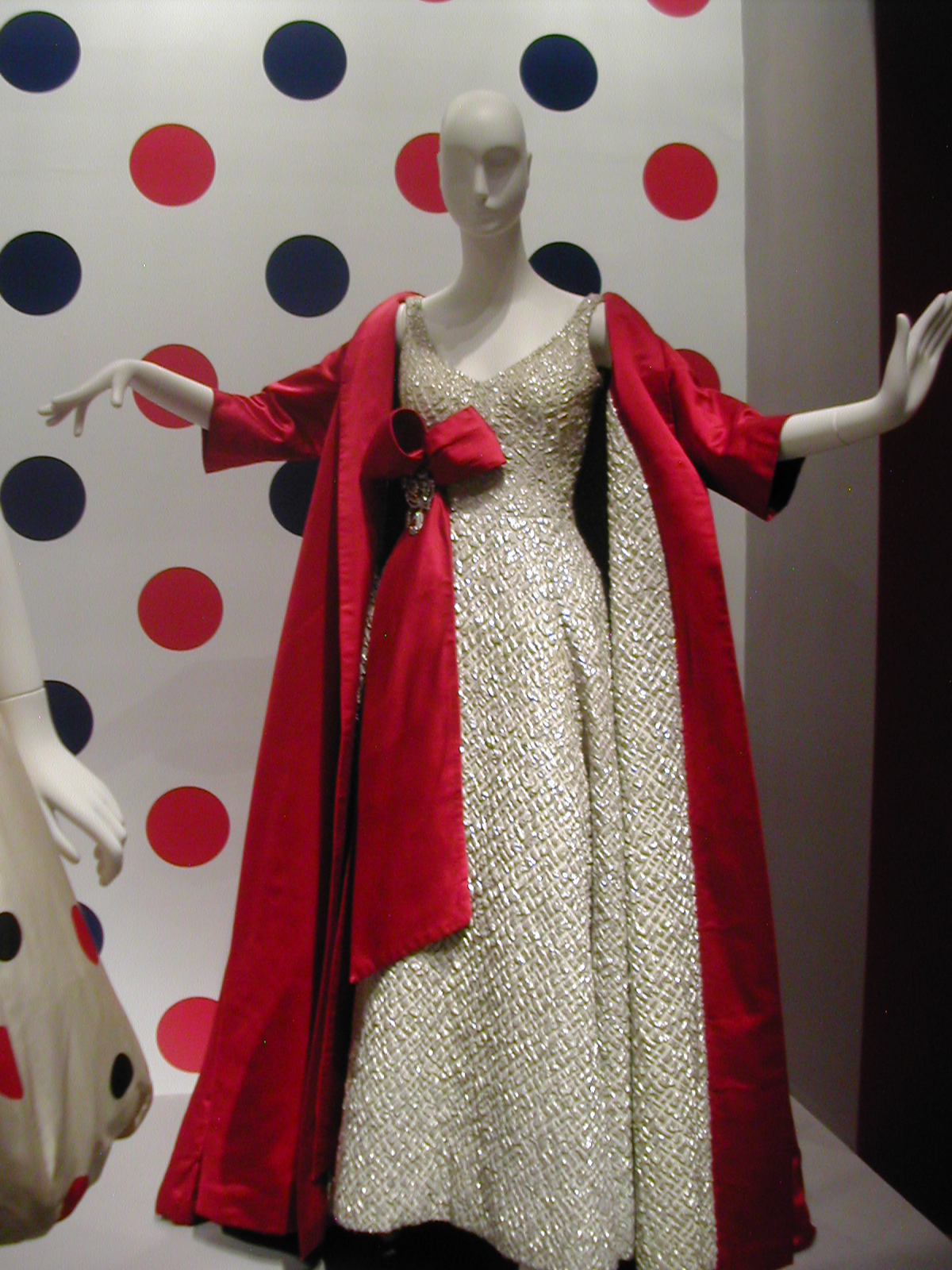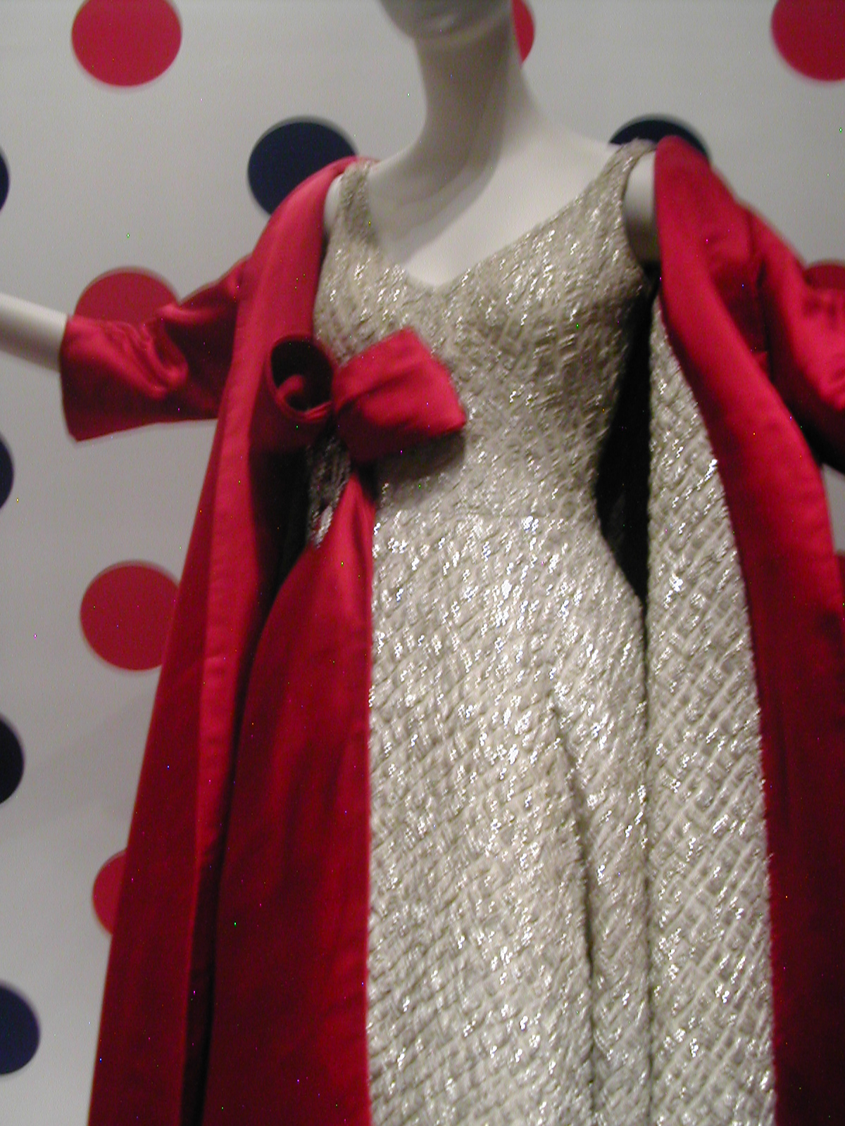 The first section of the exhibit focused on the 1960s. You can see the 1960s silhouette in the following dresses. I like that the red velvet cape has a silver lining that echoes the fabric of the dress, and the silver dress has a red velvet bow that echoes the cape. You could be a sorceress in this dress. You would certainly cast a spell.