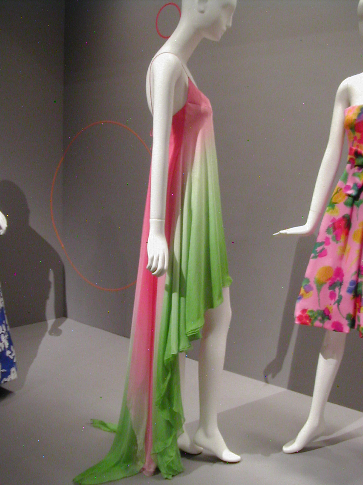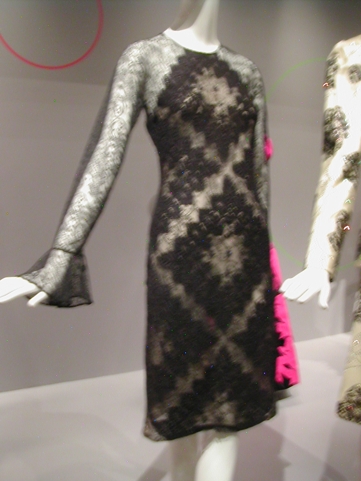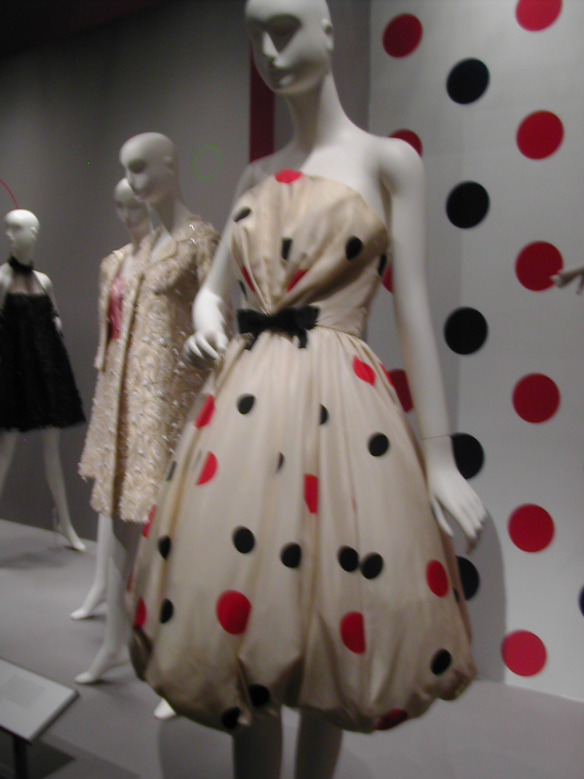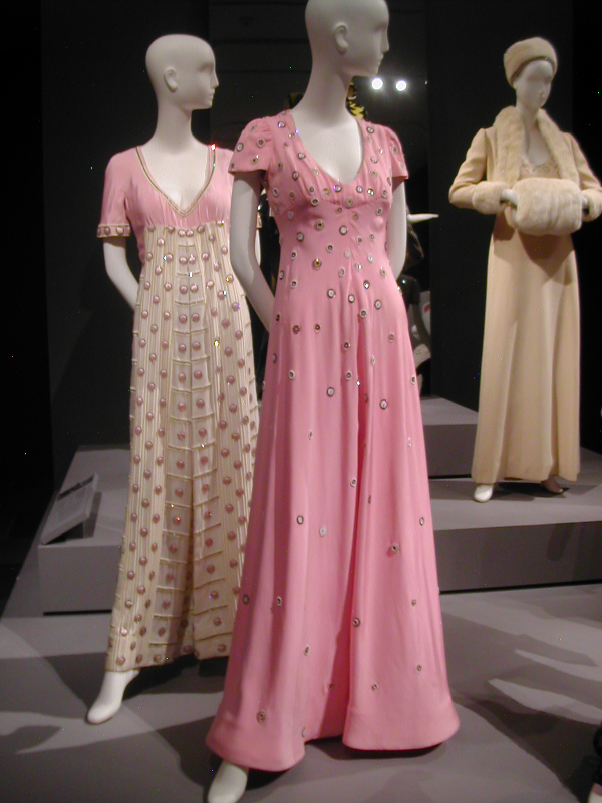 The first section of the exhibit focused on the 1960s. You can see the 1960s silhouette in the following dresses. I like that the red velvet cape has a silver lining that echoes the fabric of the dress, and the silver dress has a red velvet bow that echoes the cape. You could be a sorceress in this dress. You would certainly cast a spell.
