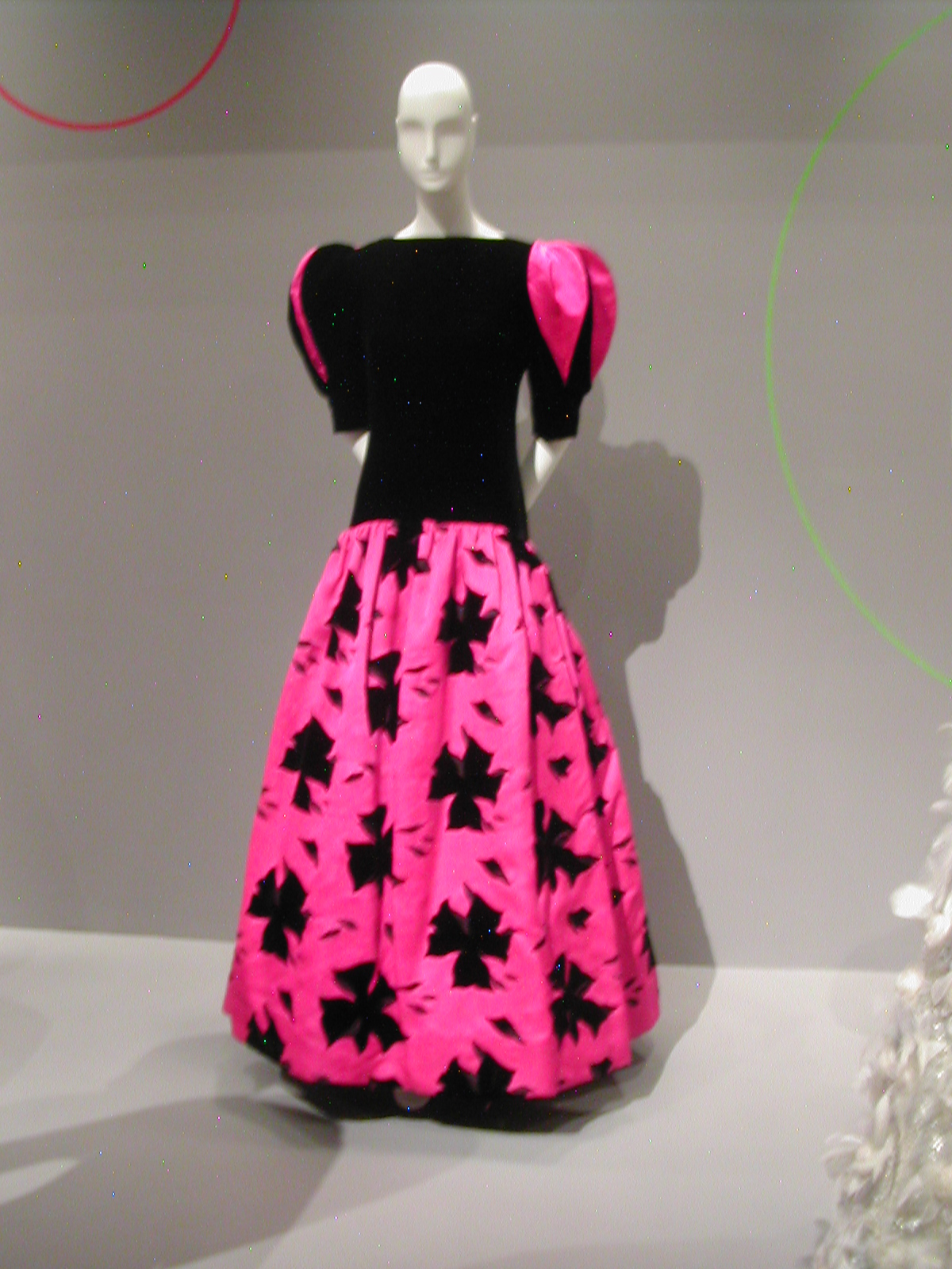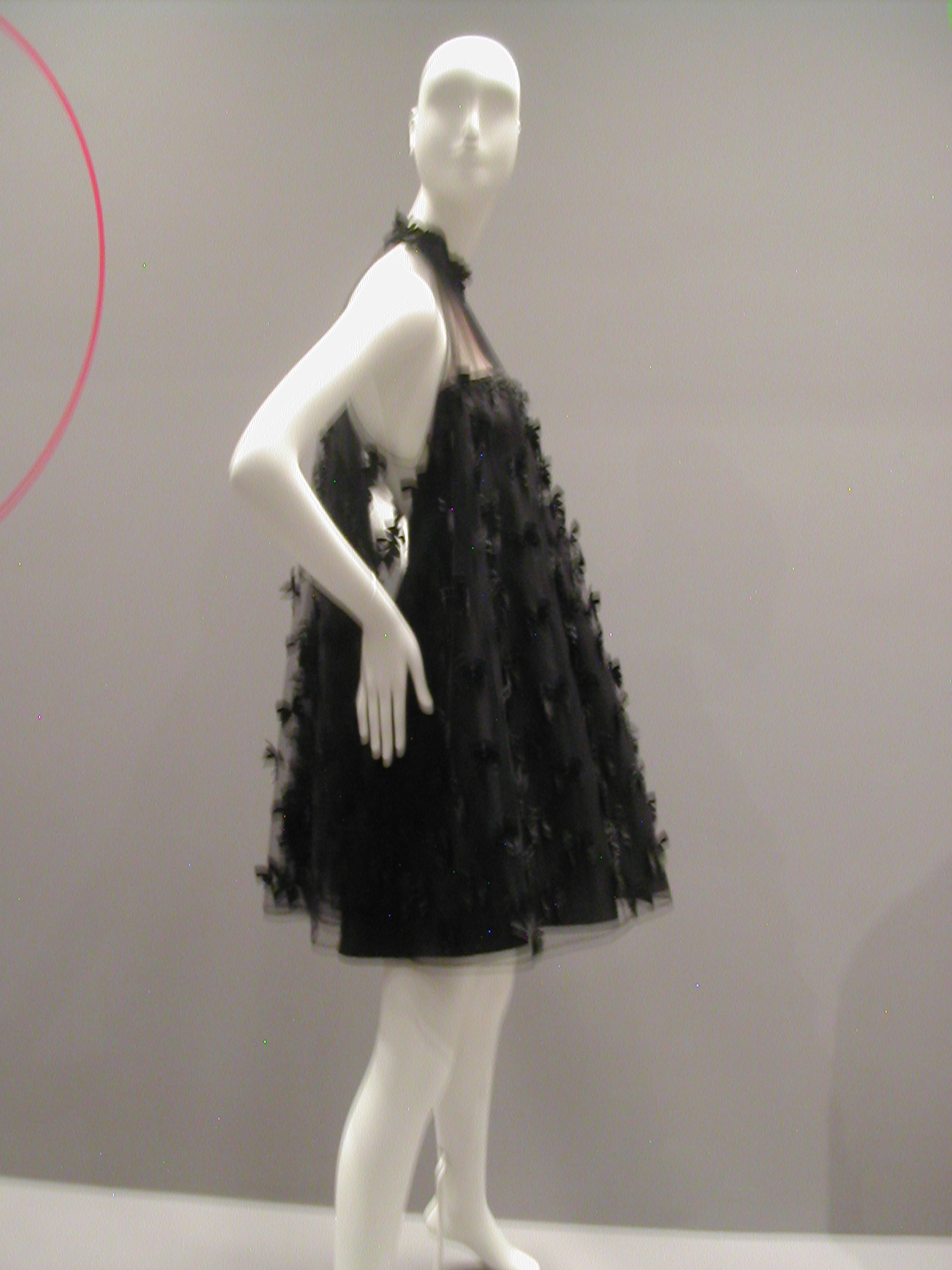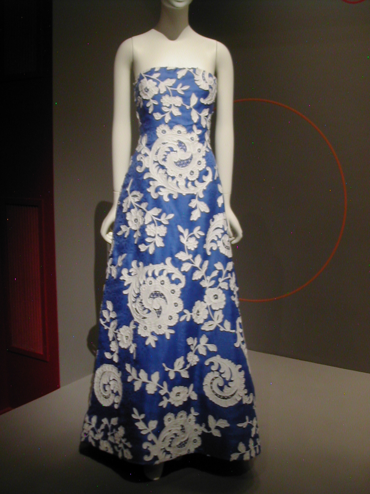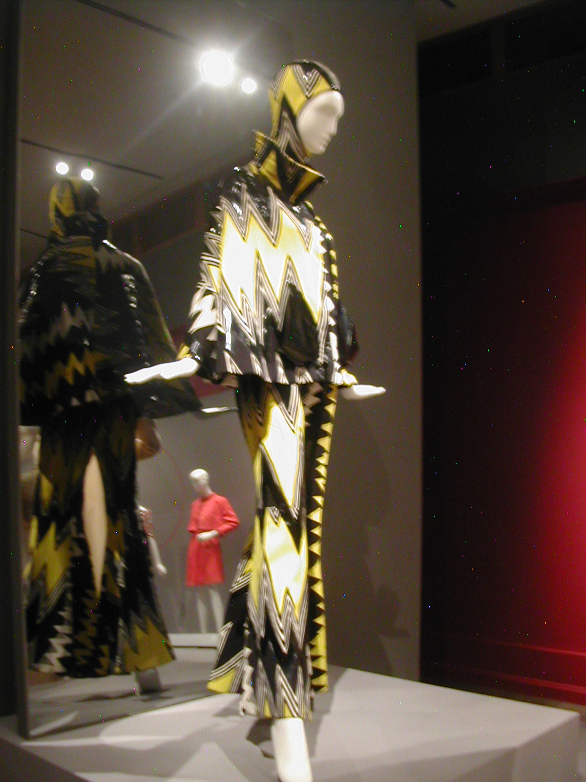 The first section of the exhibit focused on the 1960s. You can see the 1960s silhouette in the following dresses. I like that the red velvet cape has a silver lining that echoes the fabric of the dress, and the silver dress has a red velvet bow that echoes the cape. You could be a sorceress in this dress. You would certainly cast a spell.