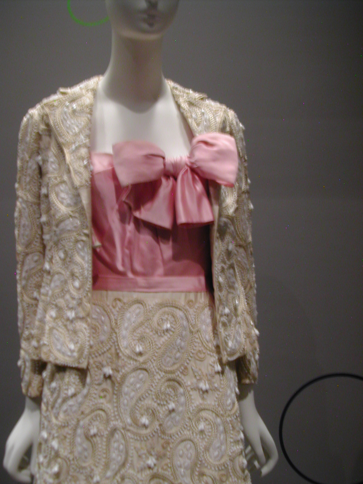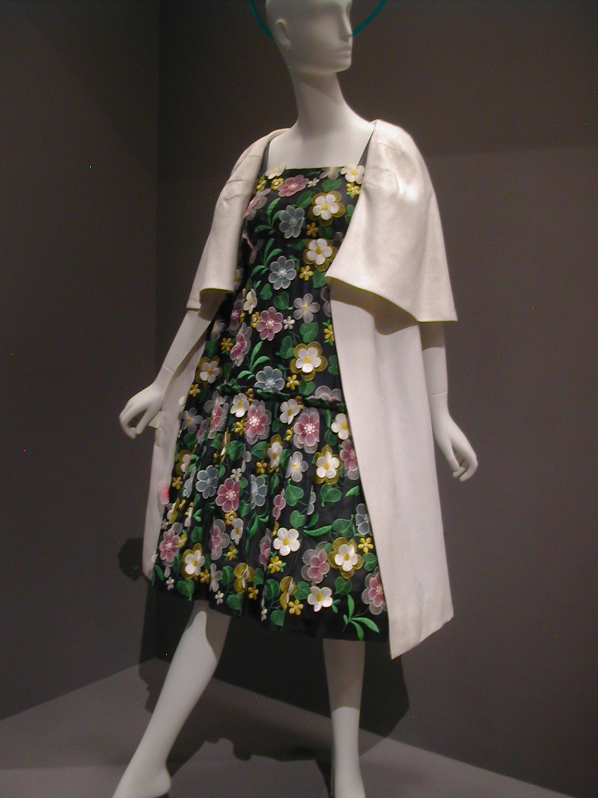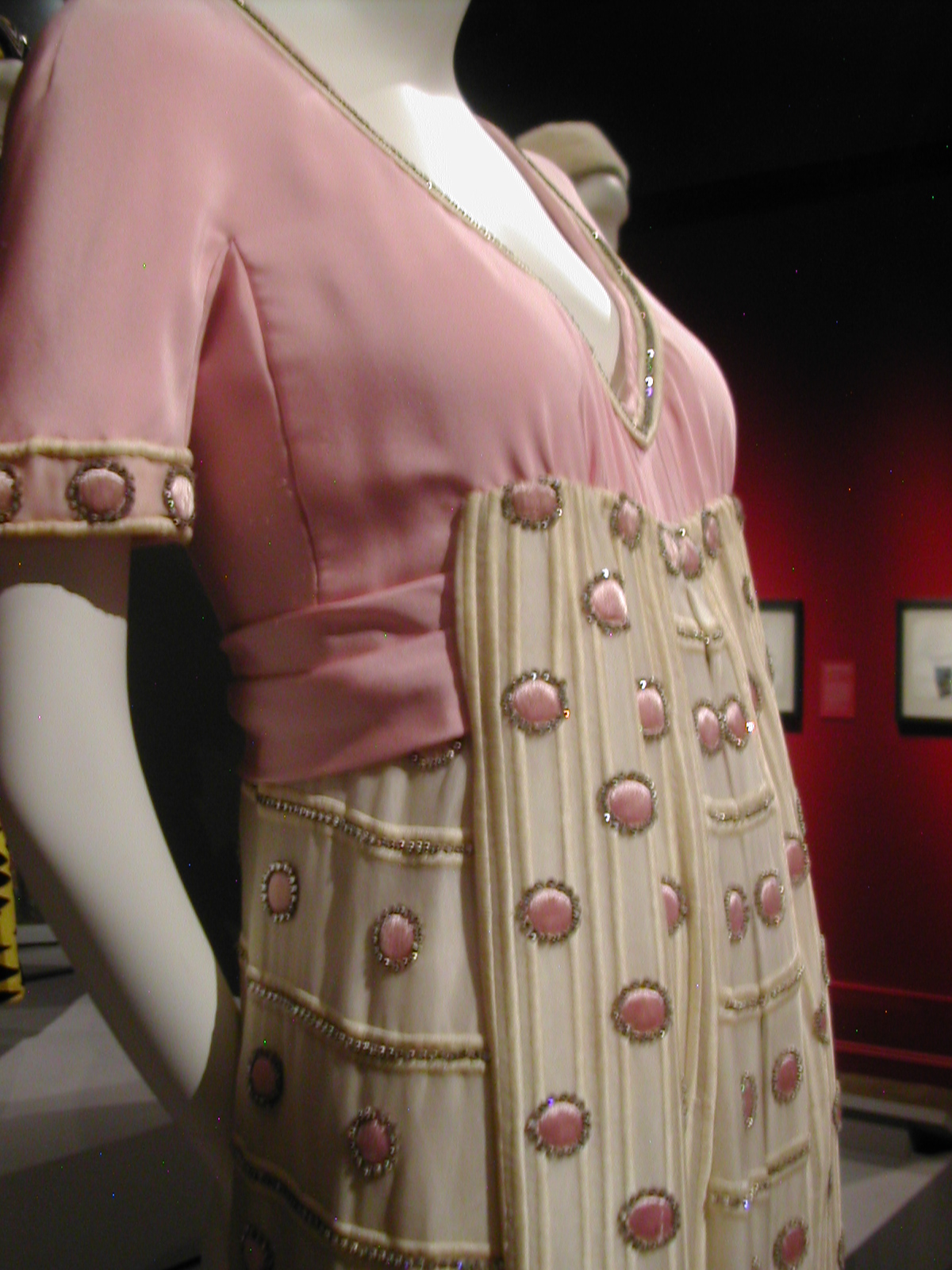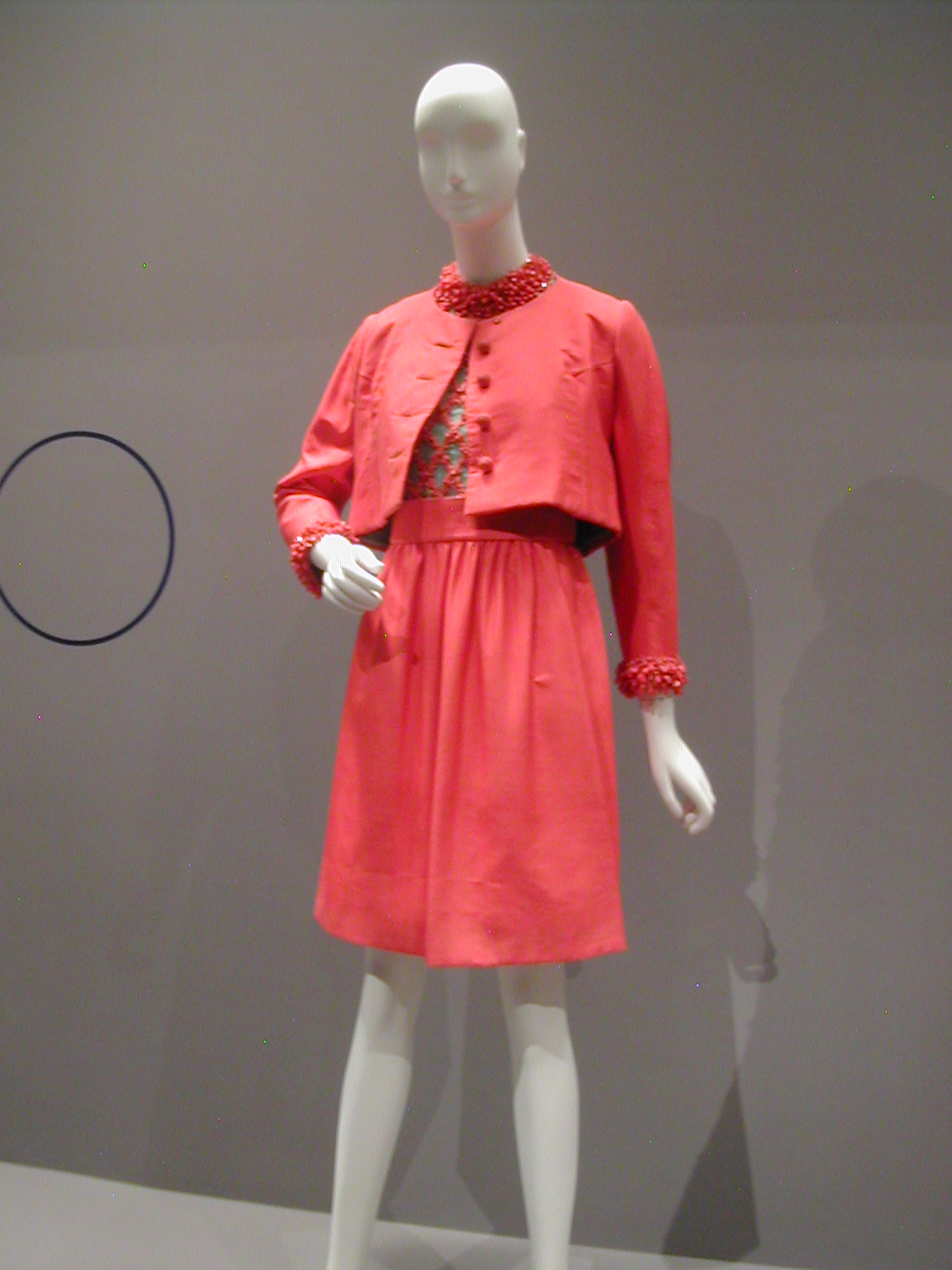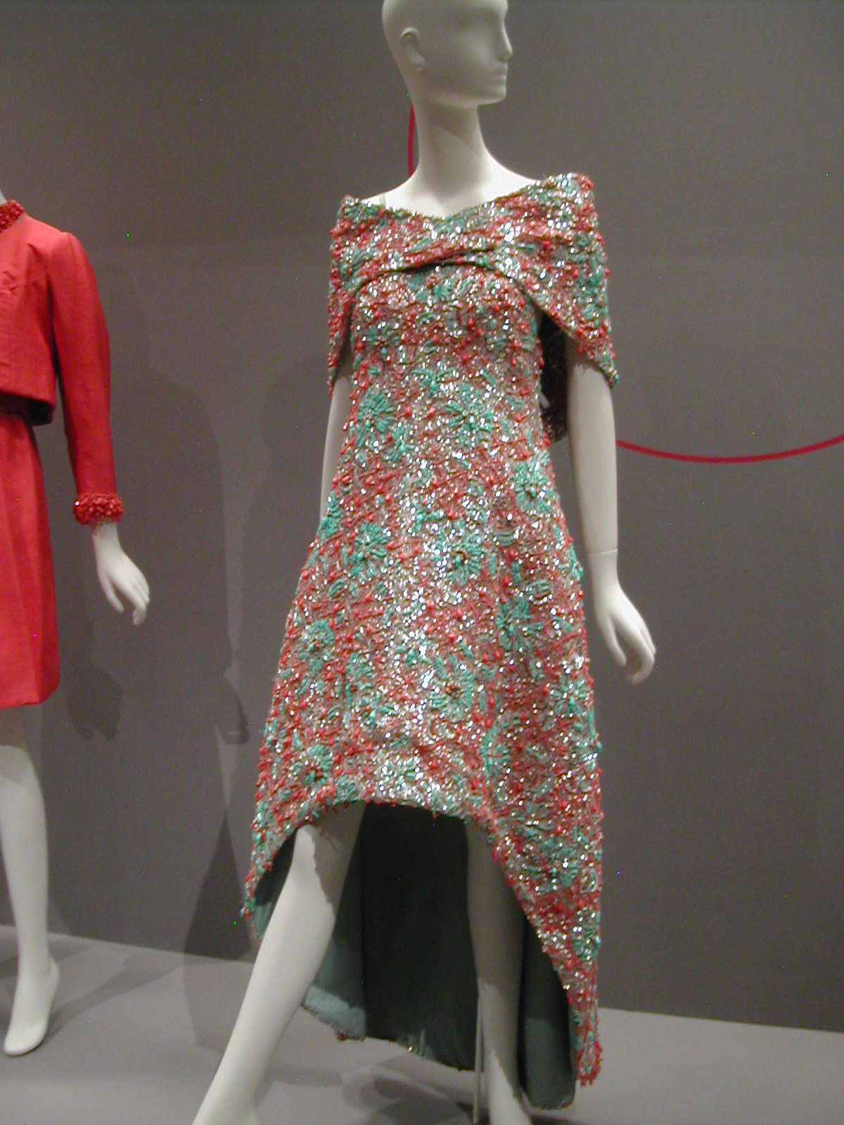 One thing that startled me about the exhibit was the mix of fabrics and other materials. Many of the dresses mixed silk and synthetics. The beading on the turquoise and coral dress below is coral – and plastic. The silhouette on the coral suit is still Chanel.