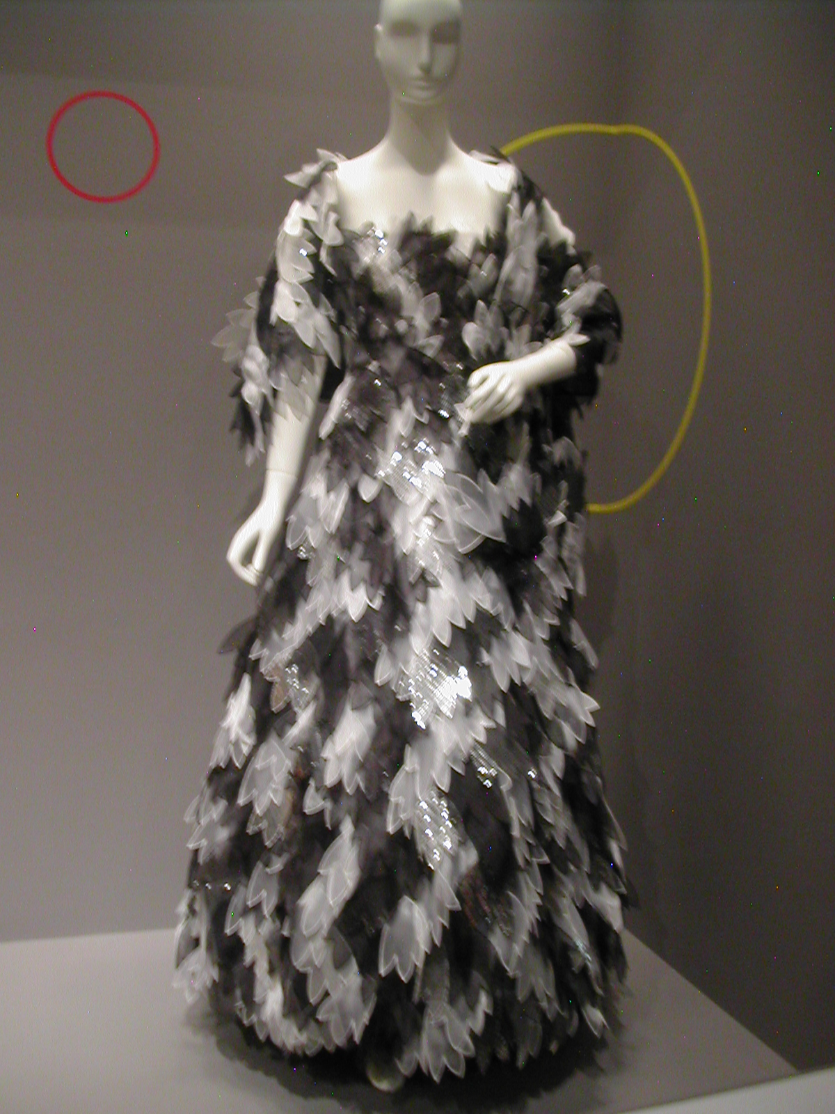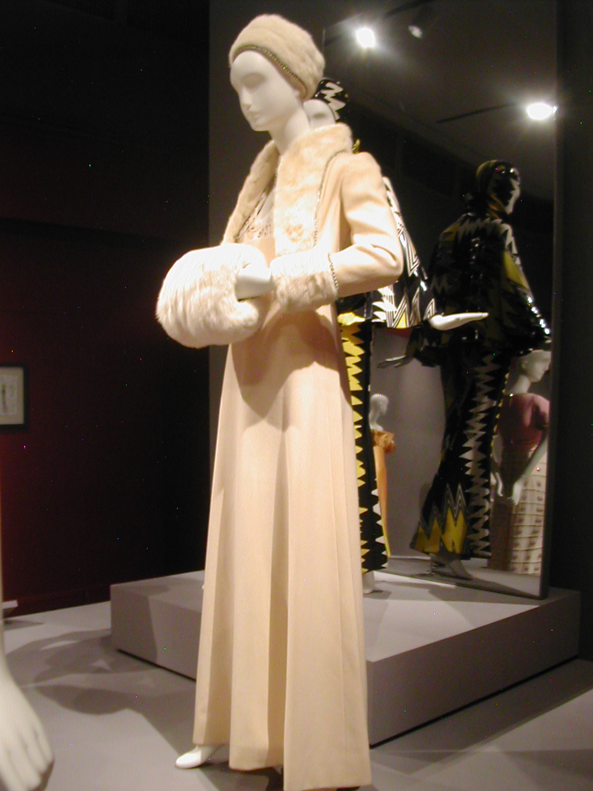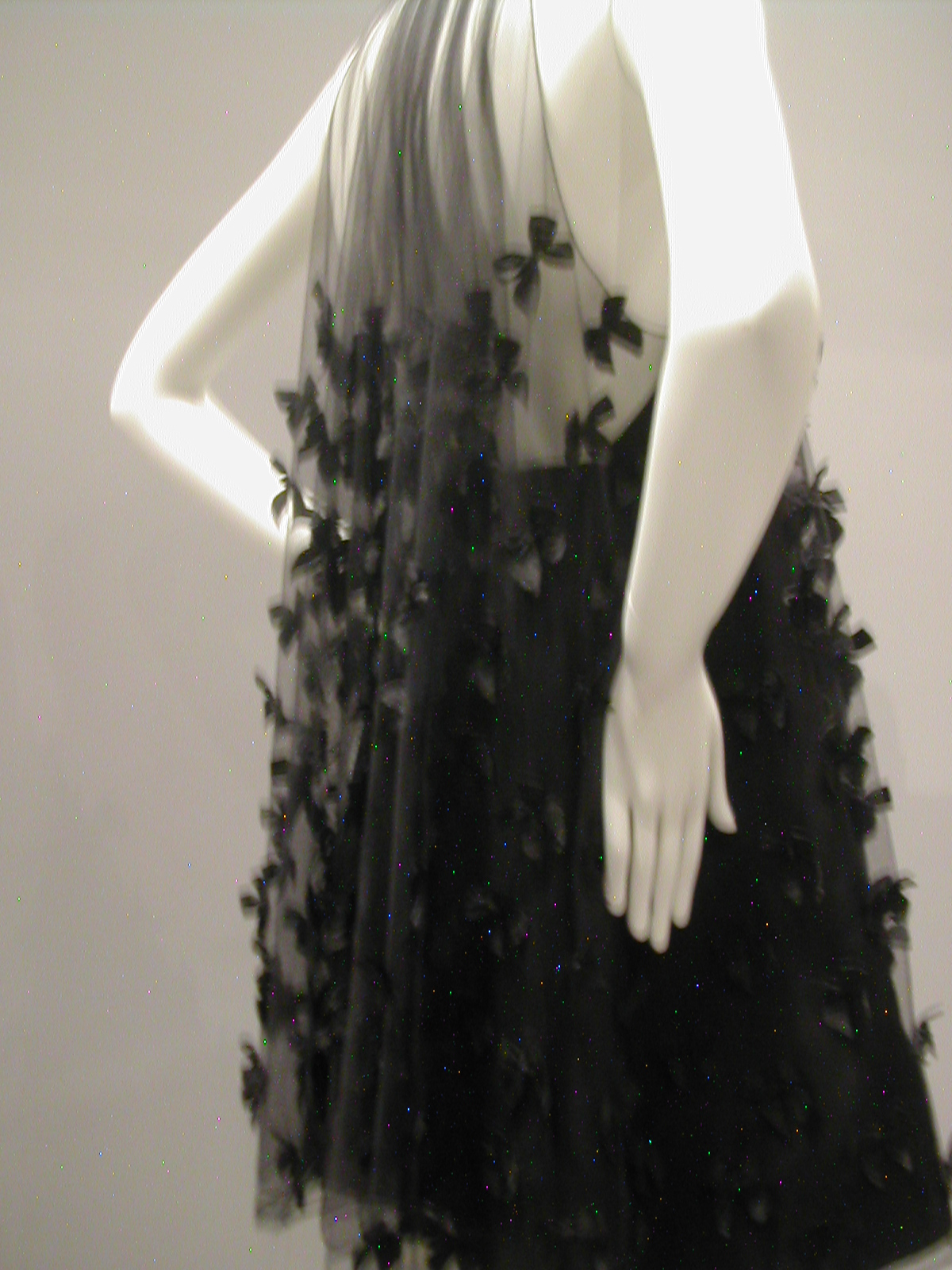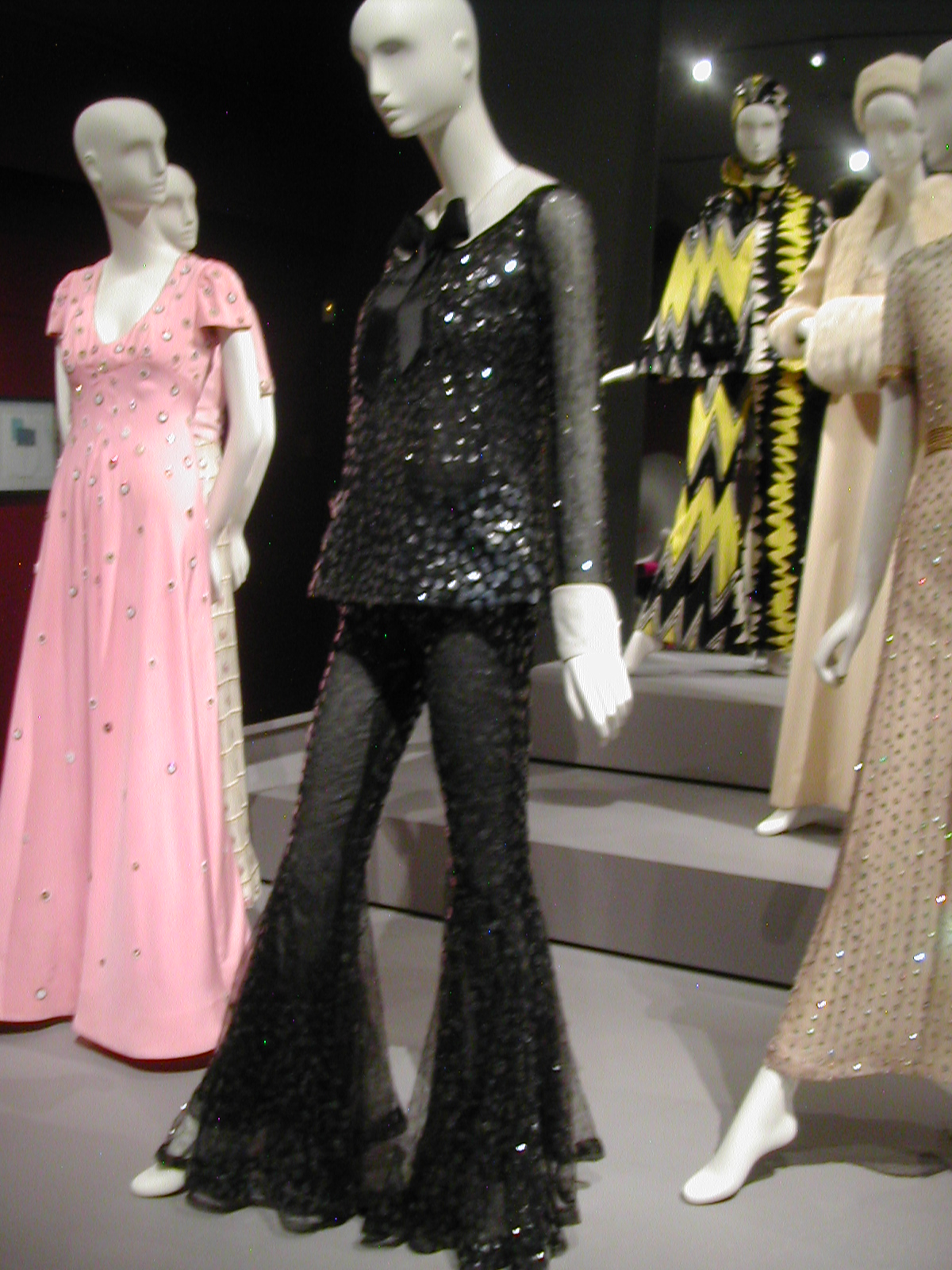 I promised that I would show you pictures of the Arnold Scaasi exhibit, so here they are. The exhibit was small, all in one room, but quite rich in terms of its range and the outfits themselves. You could spend an hour wandering around that room, looking at all the details.