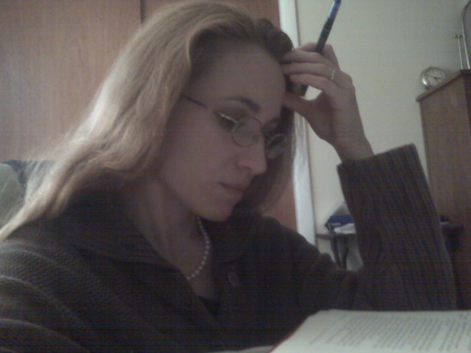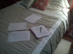 Today, I spread the copyedits out on the bed and knelt beside it, as though it were a low table. Which looked rather like this, except that this is obviously posed, because I’m holding the pen in my left hand (for effect). I’m right handed, so usually I would be holding it in my right hand. But I couldn’t get a picture from that direction that wasn’t backlit. This is me in full working mode: glasses, comfortable sweater.