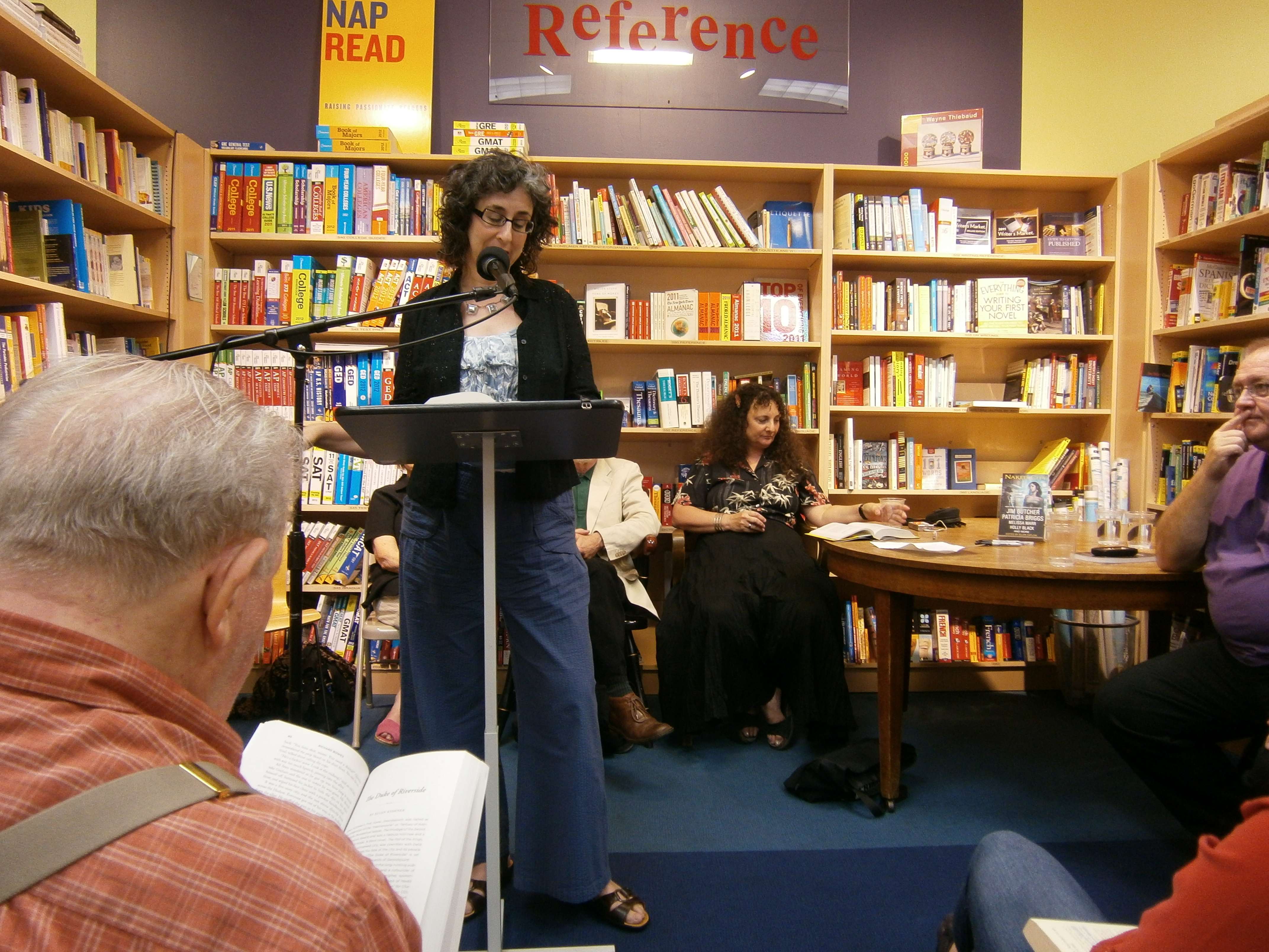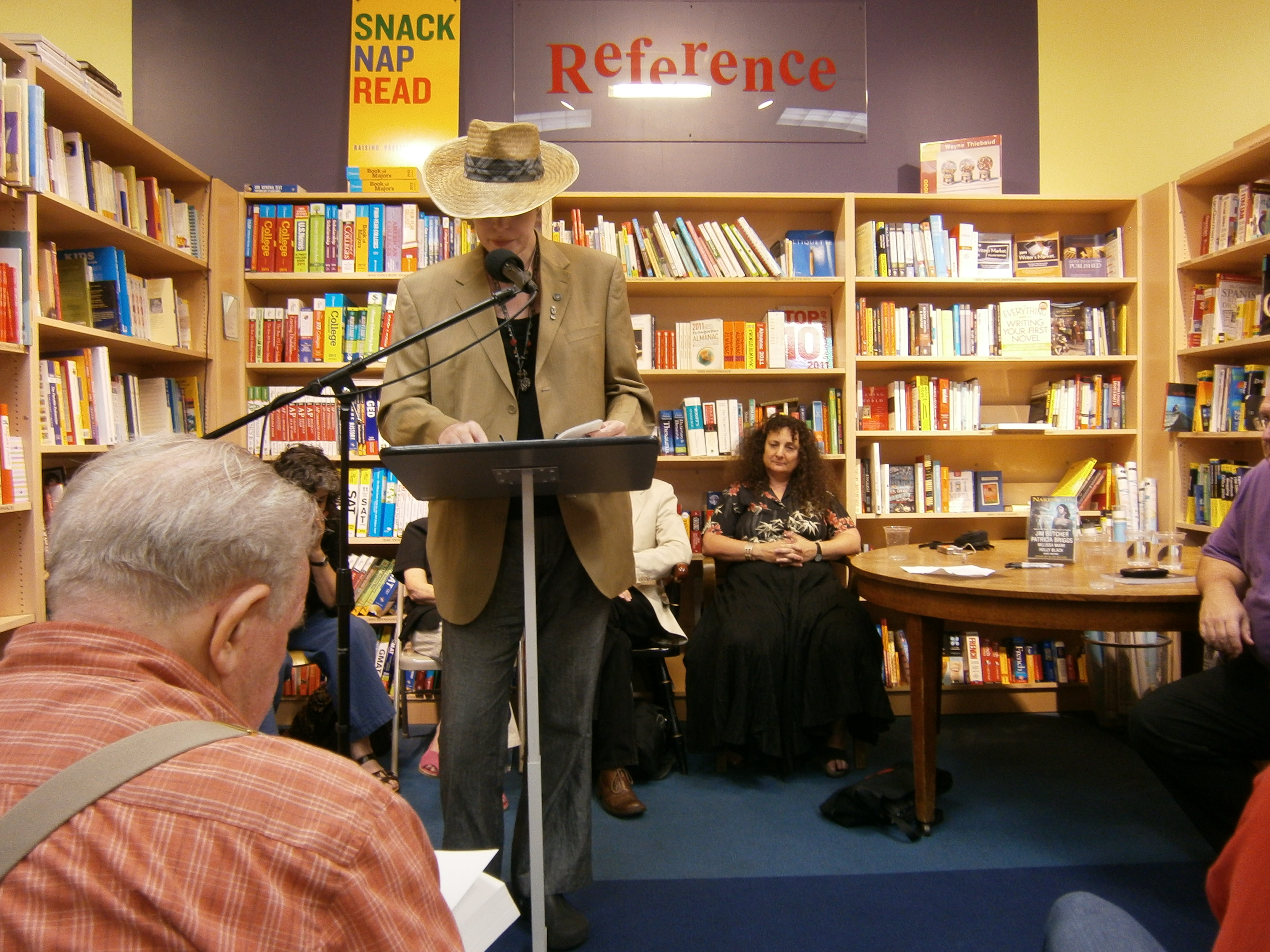 Here is Kit Reed reading, unfortunately a bit hidden by the microphone. It was an odd microphone. I always prefer reading without one, but the room was too large.