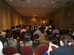 The second picture I took is from the Shirley Jackson awards. Neil Gaiman stopped by for the awards, and this is him making one of his two acceptance speeches. If you look to the lower left, you can see the back of Amanda Palmer’s head. (She used to be the lead singer of the Dresden Dolls, which made one of my favorite videos: “Coin-Operated Boy.”) In the middle of the ceremony, someone came to give him a con badge. He laughed and showed it to her. It said “Mr. Amanda F. Palmer,” which made me smile.