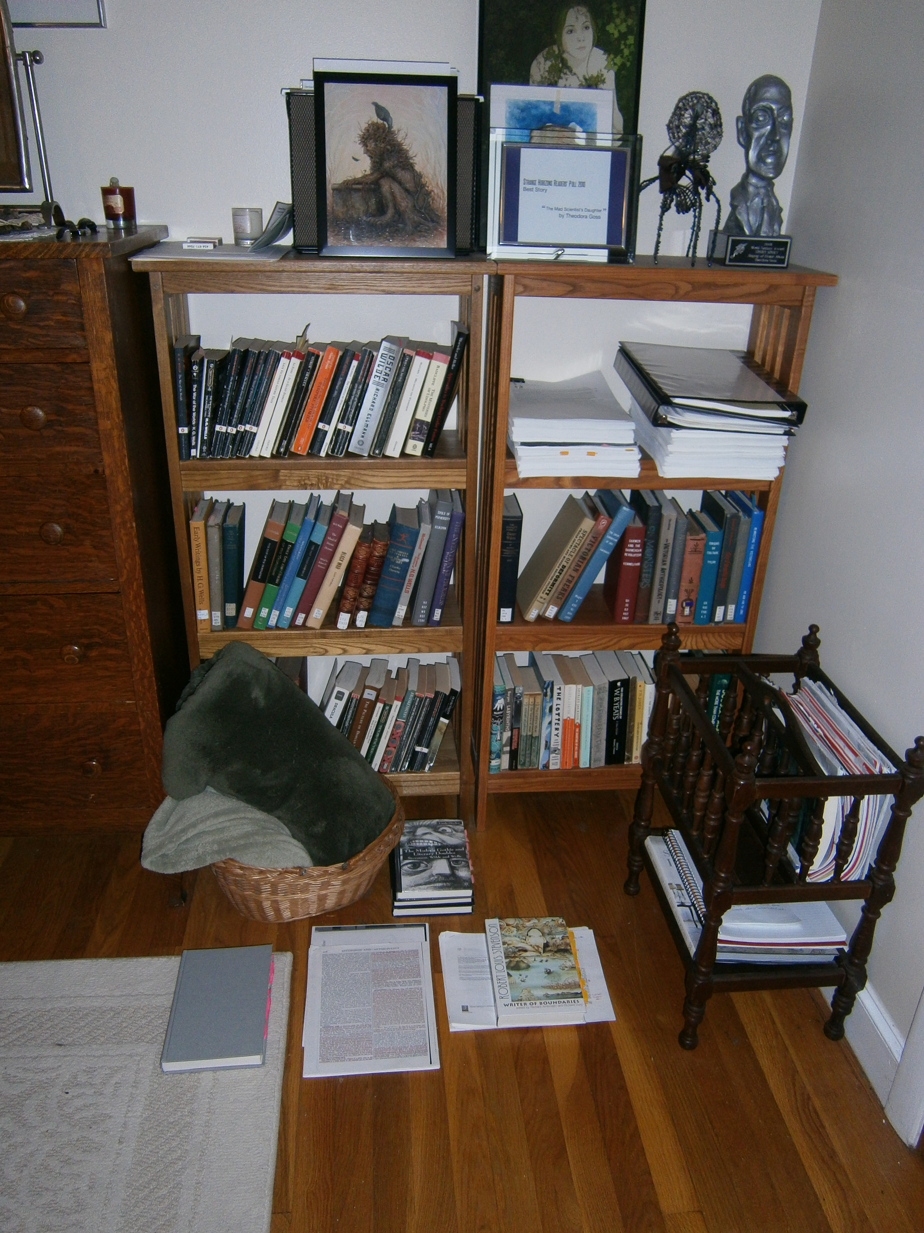In the other bedside table is the manuscript for a poetry collection that I’ve had no time to work on. The shelves are covered with writing projects in piles.
