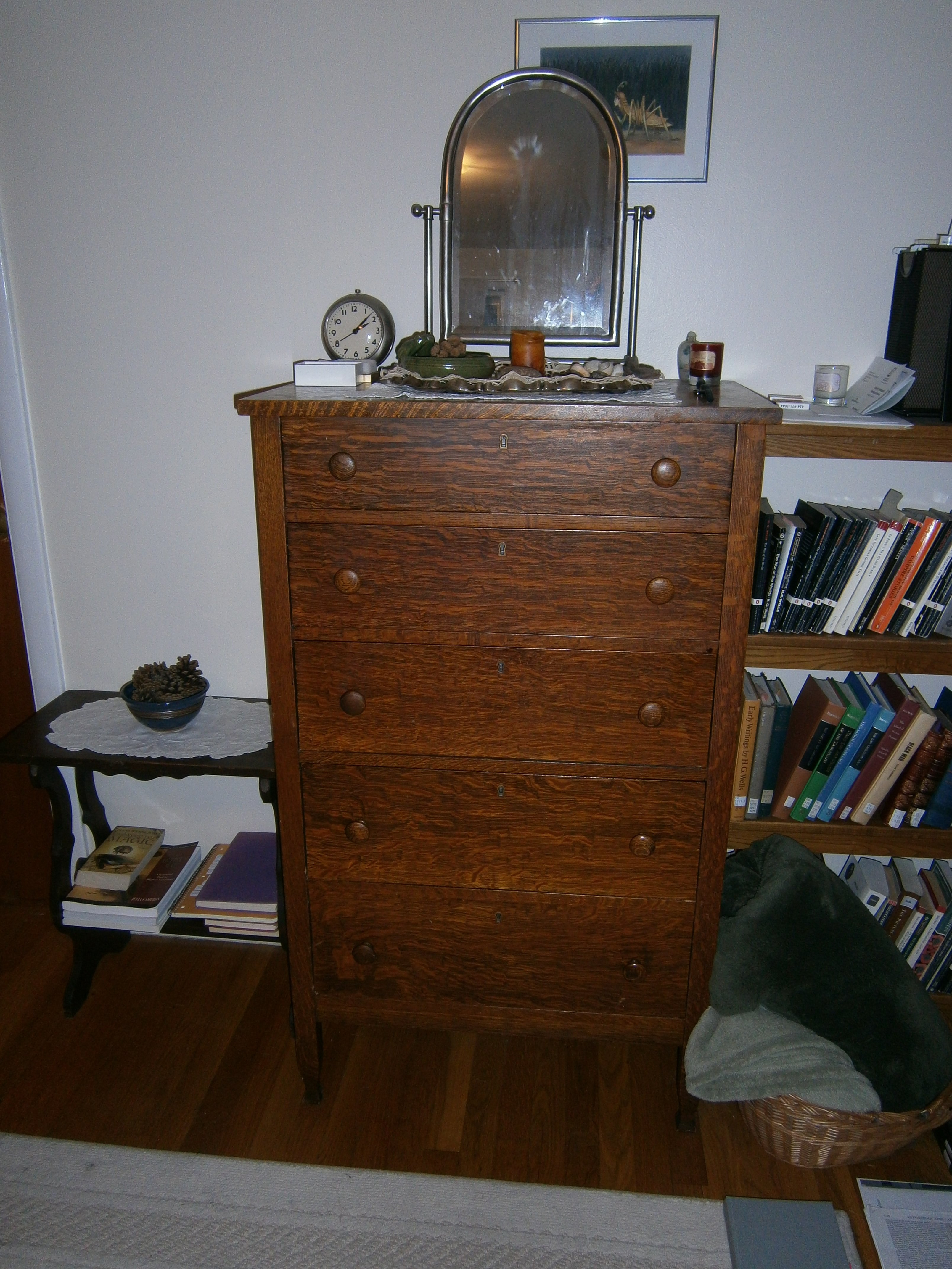 The necklace I bought is still on top of the dresser in its box, rather than in its proper place in my jewelry drawer. I still need to move the painting behind the mirror.