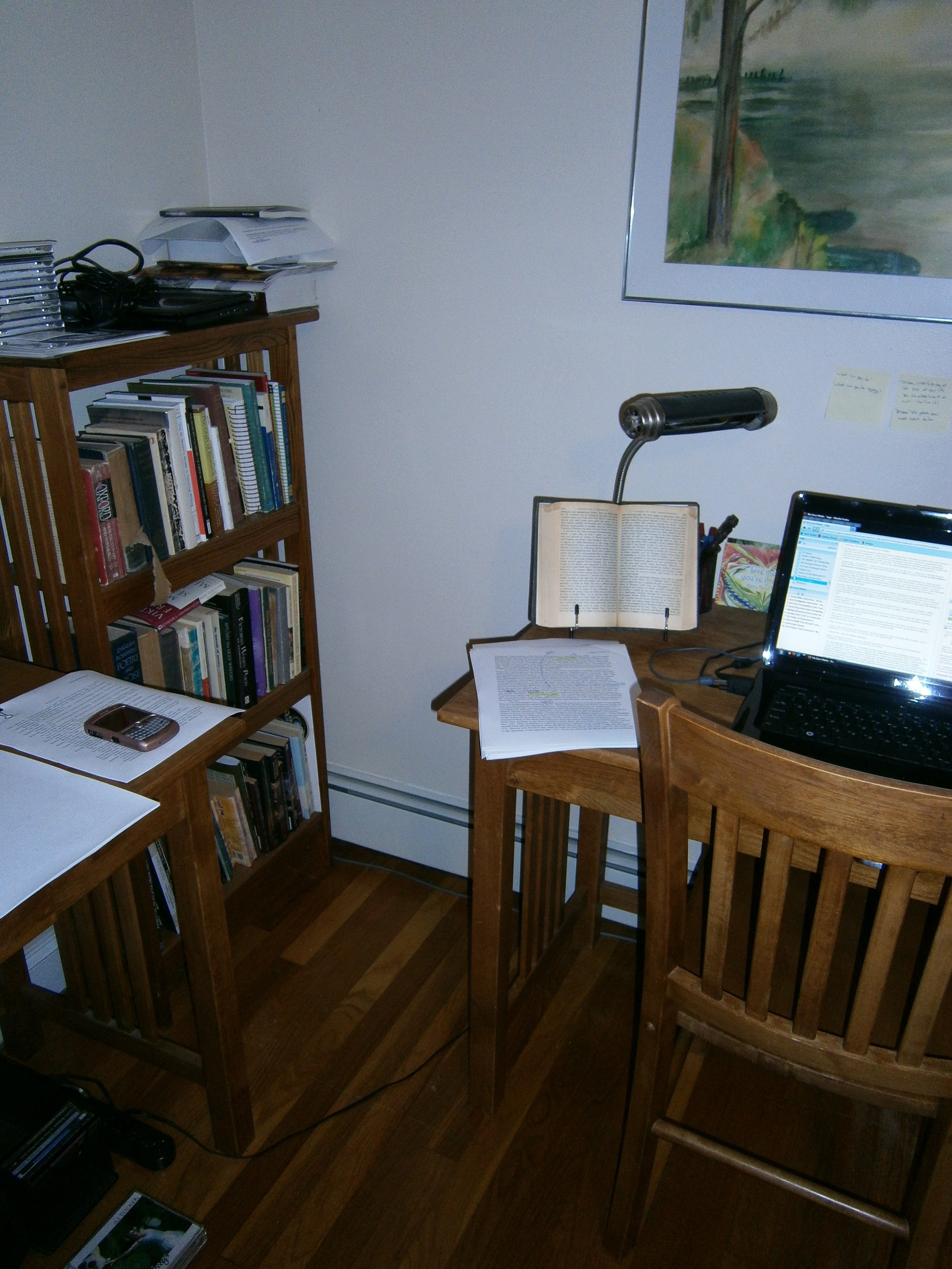 There are stickies on the walls and on my desk. The desk itself has a constantly revolving pile of papers, depending on what I’m working on that day.