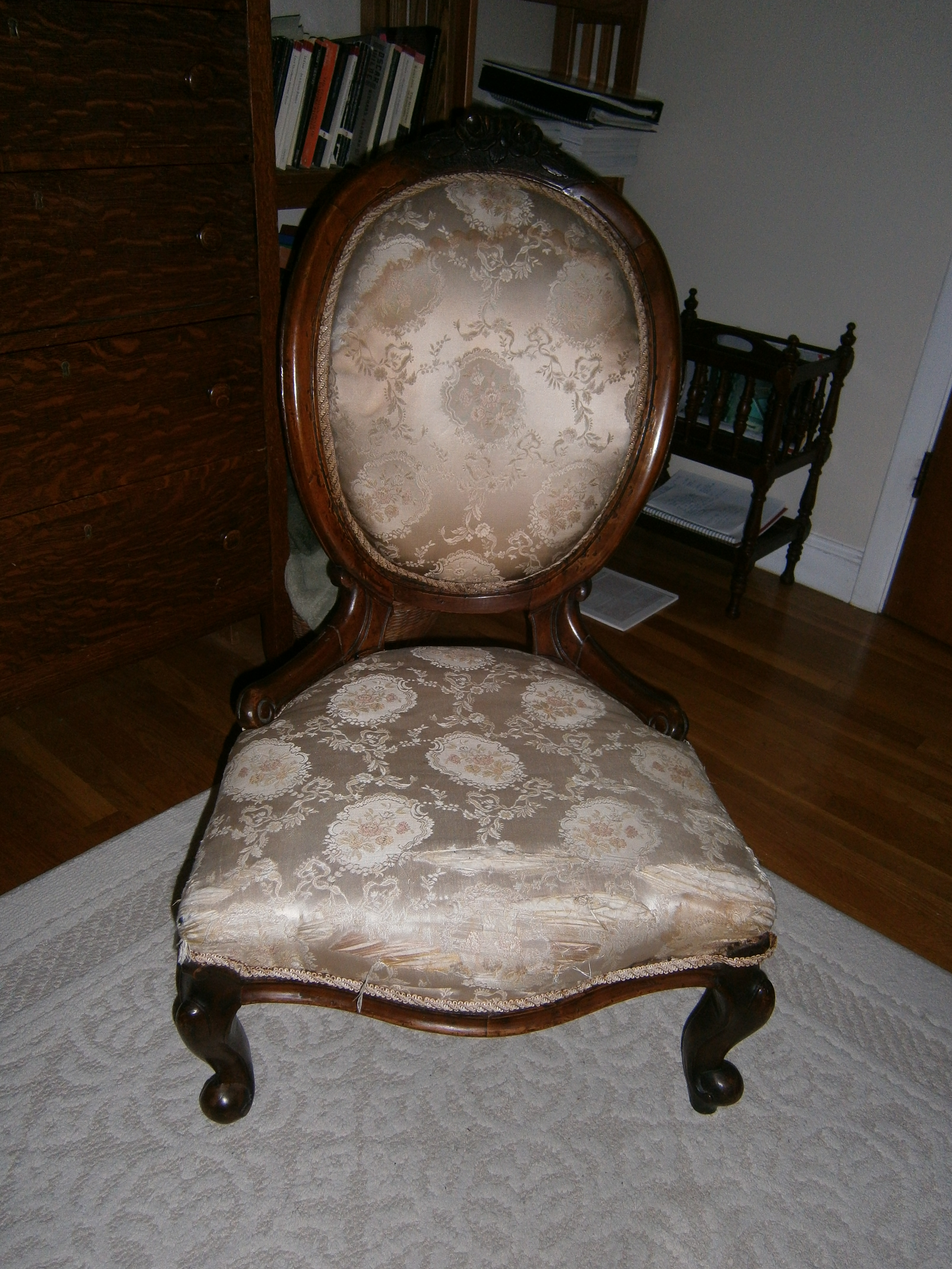 I know, the upholstery is tattered and stained. But the chair itself is a lovely old Victorian piece, with roses carved on the top. (Those did not come through well in the photograph.) It will need to be reupholstered, of course, which means that my $40 chair (yes, that’s how much I paid for it) will probably need another $140 worth of work. But I saw it sitting outside the antiques store, and something drew me to it. Some pieces of furniture have a sort of charm about them, something that makes them particularly attractive. I liked its proportions and how low it was: the perfect height for me. I can imagine it reupholstered in a Waverly pattern, perhaps something with roses on it. And I have to say, when I sit in the chair, even in its current tattered state, it has a sort of magic about it: I feel calmer. I think proportions do that to us, make us feel certain ways. In my grandmother’s apartment in Budapest, with its 18-foot ceilings and enormous windows, I always feel calm and at ease.