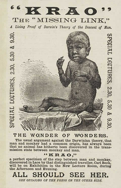 The second story is one I researched for my dissertation. It’s the story of Krao, a girl from what was then known as Indochina who was brought to England and displayed as a freak. Based on pictures of her, it’s obvious that she’s a fairly standard “bearded lady,” meaning that she has the sort of facial hair one would expect on a man. But at the time she was advertised as a Darwinian “missing link,” an atavistic throwback who demonstrated the validity of evolutionary theory. She was first displayed as a child. Eventually, she grew up and married the showman who had first discovered her. She continued to perform in freak shows for the rest of her life. (I’m using the scholarly terminology here – this is how scholars who study the history of freak shows speak about the participants, as performers. Their relationships with the people who displayed them could certainly be exploitative. But some of them also exercised agency and created lives for themselves.) I can’t find a photograph of Krao that isn’t exploitative, but you can see from this advertisement how she was presented to the public: