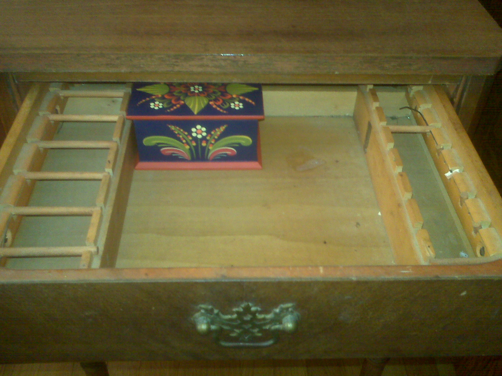 If you open the top drawer, you can see places where spools used to be kept. I think I’ll leave that as is, although it does need cleaning, and fixing because there are stray wires and the like. And the stubs of old broken dowels that need to be removed. (The small painted box comes from Poland, and it’s where I keep my rings.)