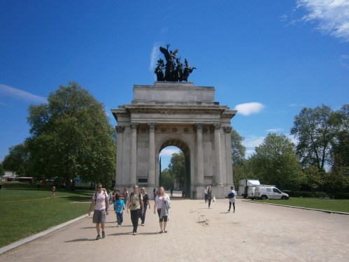 In this post, I’ll just include pictures from Hyde Park. I’ll save Kensington Gardens for tomorrow. Of course, you know that Hyde Park is where the ladies and gentlemen would walk and ride. As I was walking along the park, I took a picture of Rotten Row (whose name is evidently a corruption of Route de Roi, the king’s way). At one point, I saw three girls, very properly equipped and on lovely Thoroughbreds, riding along that dirt track. (You can see that dirt track below, by the way. I think Dorian may have been seen riding there in The Picture of Dorian Gray? But I’d have to check.)
