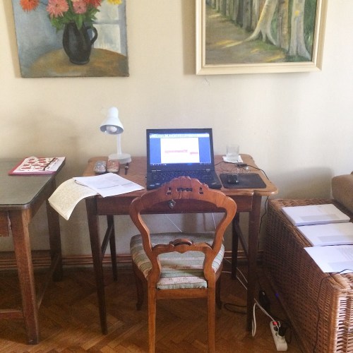 (These photographs are of me revising the sequel to The Strange Case of the Alchemist’s Daughter in Budapest, where I spent parts of July and August. One of the things writing has allowed me to do recently is travel back home to Hungary once a year. Ironically, a five-week trip to Hungary costs about as much as a single five-day convention . . .)
