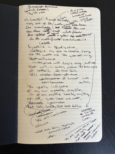 Would you like to see what my poetic process looks like? If not, you can stop reading now . . . But if you want to see, I’ll show you. Recently, I wrote a poem that annoyed me very much. I wrote the first draft back in September, with a pen in the notebook I carry around in my purse, standing on the footbridge described in the poem and looking at the leaves growing up from the water below. I didn’t know what the leaves were, so I did an internet search on my cell phone, and they turned out to be broadleaf arrowhead leaves. Then, I wrote a poem about them. It looked like this: