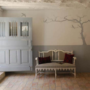 Hallway pastel blue period front door antique bench sofa terracotta brick flooring grey painted silhouette tree and birds mural large ceramic pot real home L etc 01/2009 not used
